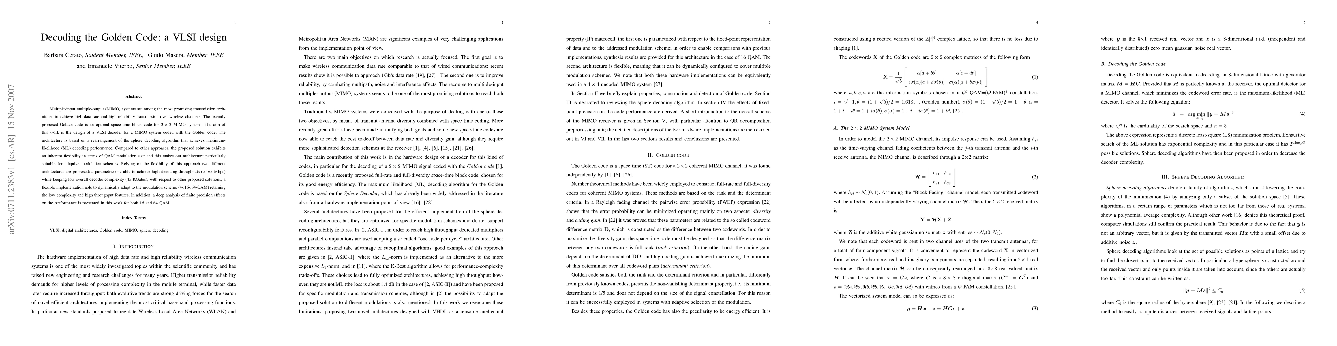 The recently proposed Golden code is an optimal space-time block code for 2 X 2 multiple-input multiple-output (MIMO) systems. The aim of this work is the design of a VLSI decoder for a MIMO system coded with the Golden code. The architecture is based on a rearrangement of the sphere decoding algorithm that achieves maximum-likelihood (ML) decoding performance. Compared to other approaces, the proposed solution exhibits an inherent flexibility in terms of modulation schemes QAM modulation size and this makes our architecture particularly suitable for adaptive modulation schemes.