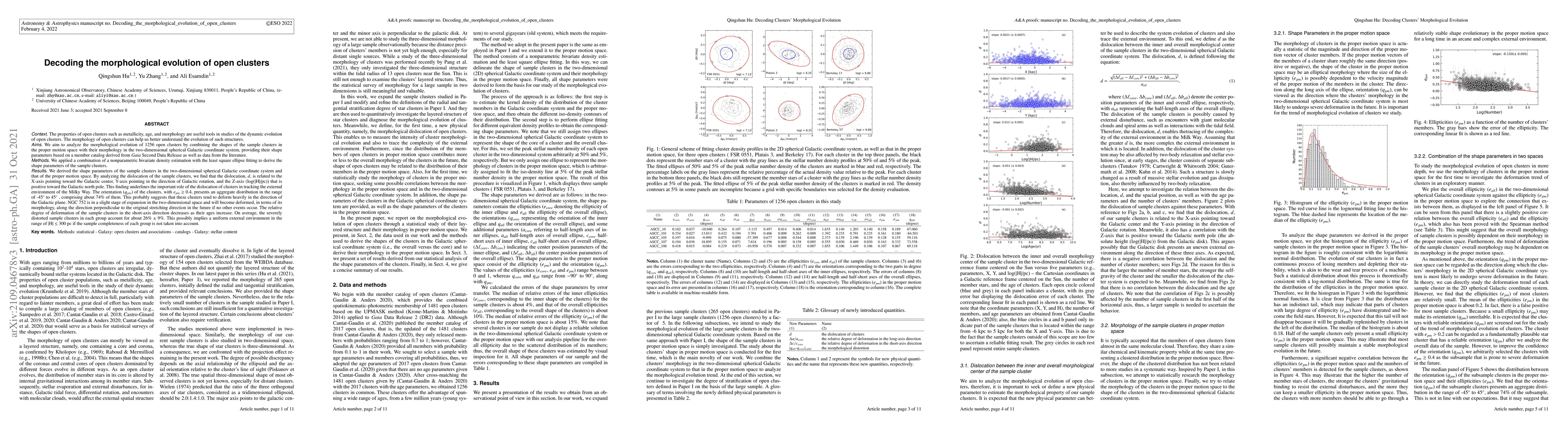 Base on Gaia Second Data Release and the combination of nonparametric bivariate density estimation with the least square ellipse fitting, we derive the shape parameters of the sample clusters. By analyzing the dislocation of the sample clusters, the dislocation $d$ is related to the X-axis pointing toward the Galactic center, Y-axis pointing in the direction of Galactic rotation, and the Z-axis (log(|H|/pc)) that is positive toward the Galactic north pole. This finding underlines the important role of the dislocation of clusters in tracking the external environment of the Milky Way. The orientation ($q_{pm}$) of the clusters with $e_{pm}$ $\geq$ 0.4 presents an aggregate distribution in the range of -45$\degr$ to 45$\degr$, about 74\% of them. This probably suggests that these clusters tend to deform heavily in the direction of the Galactic plane. NGC 752 is in a slight stage of expansion in the two-dimensional space and will deform itself morphology along the direction perpendicular to the original stretching direction in the future if no other events occur. The relative degree of deformation of the sample clusters in the short-axis direction decreases as their ages increase. On average, the severely distorted sample clusters in each group account for about 26\% $\pm$ 9\%. This possibly implies a uniform external environment in the range of $|$H$|$ $\leq$ 300 pc if the sample completeness of each group is not taken into account.