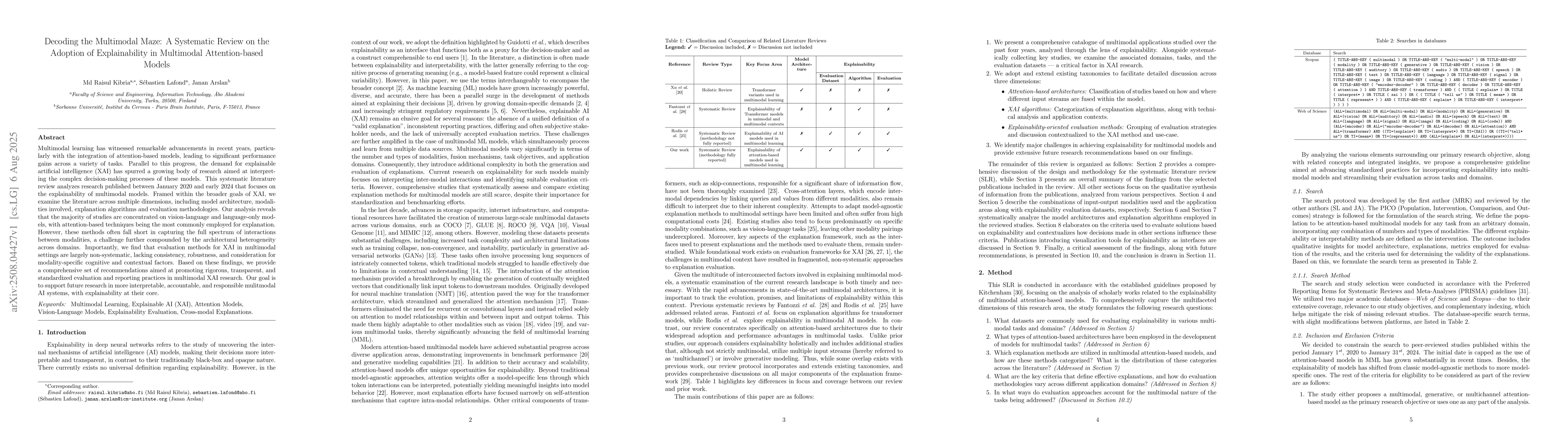 Multimodal learning has witnessed remarkable advancements in recent years, particularly with the integration of attention-based models, leading to significant performance gains across a variety of tasks. Parallel to this progress, the demand for explainable artificial intelligence (XAI) has spurred a growing body of research aimed at interpreting the complex decision-making processes of these models. This systematic literature review analyzes research published between January 2020 and early 2024 that focuses on the explainability of multimodal models. Framed within the broader goals of XAI, we examine the literature across multiple dimensions, including model architecture, modalities involved, explanation algorithms and evaluation methodologies. Our analysis reveals that the majority of studies are concentrated on vision-language and language-only models, with attention-based techniques being the most commonly employed for explanation. However, these methods often fall short in capturing the full spectrum of interactions between modalities, a challenge further compounded by the architectural heterogeneity across domains. Importantly, we find that evaluation methods for XAI in multimodal settings are largely non-systematic, lacking consistency, robustness, and consideration for modality-specific cognitive and contextual factors. Based on these findings, we provide a comprehensive set of recommendations aimed at promoting rigorous, transparent, and standardized evaluation and reporting practices in multimodal XAI research. Our goal is to support future research in more interpretable, accountable, and responsible mulitmodal AI systems, with explainability at their core.