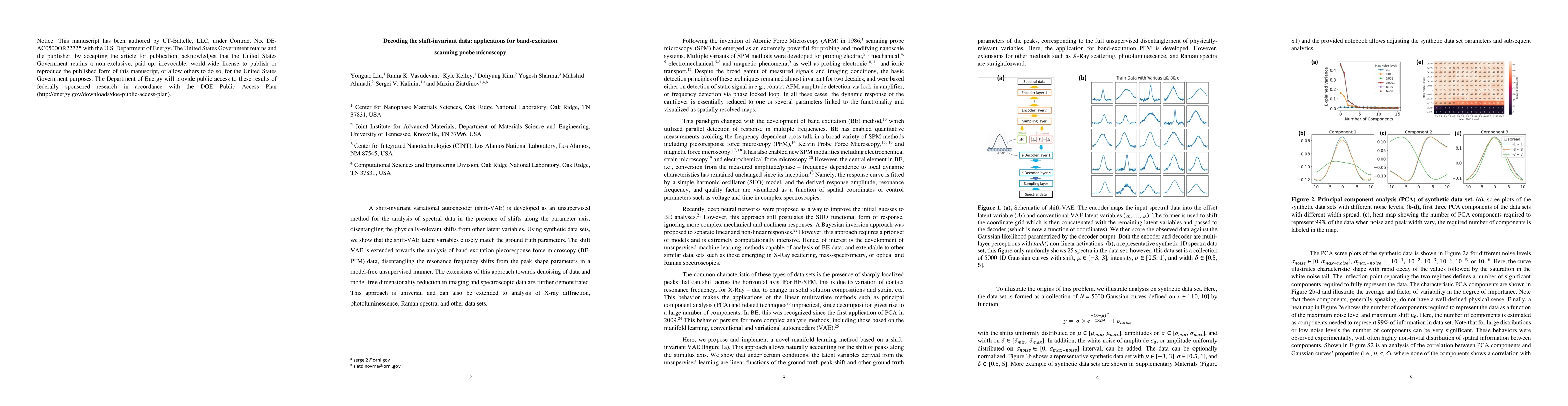 A shift-invariant variational autoencoder (shift-VAE) is developed as an unsupervised method for the analysis of spectral data in the presence of shifts along the parameter axis, disentangling the physically-relevant shifts from other latent variables. Using synthetic data sets, we show that the shift-VAE latent variables closely match the ground truth parameters. The shift VAE is extended towards the analysis of band-excitation piezoresponse force microscopy (BE-PFM) data, disentangling the resonance frequency shifts from the peak shape parameters in a model-free unsupervised manner. The extensions of this approach towards denoising of data and model-free dimensionality reduction in imaging and spectroscopic data are further demonstrated. This approach is universal and can also be extended to analysis of X-ray diffraction, photoluminescence, Raman spectra, and other data sets.