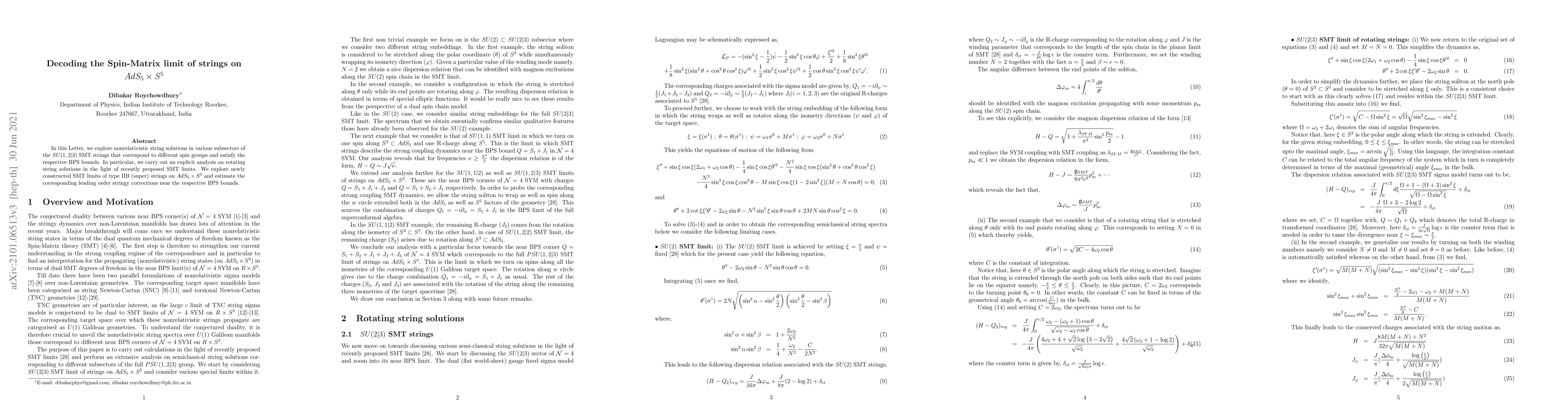 In this Letter, we explore nonrelativistic string solutions in various subsectors of the $ SU(1,2|3) $ SMT strings that correspond to different spin groups and satisfy the respective BPS bounds. In particular, we carry out an explicit analysis on rotating string solutions in the light of recently proposed SMT limits. We explore newly constructed SMT limits of type IIB (super) strings on $ AdS_5 \times S^5 $ and estimate the corresponding leading order stringy corrections near the respective BPS bounds.