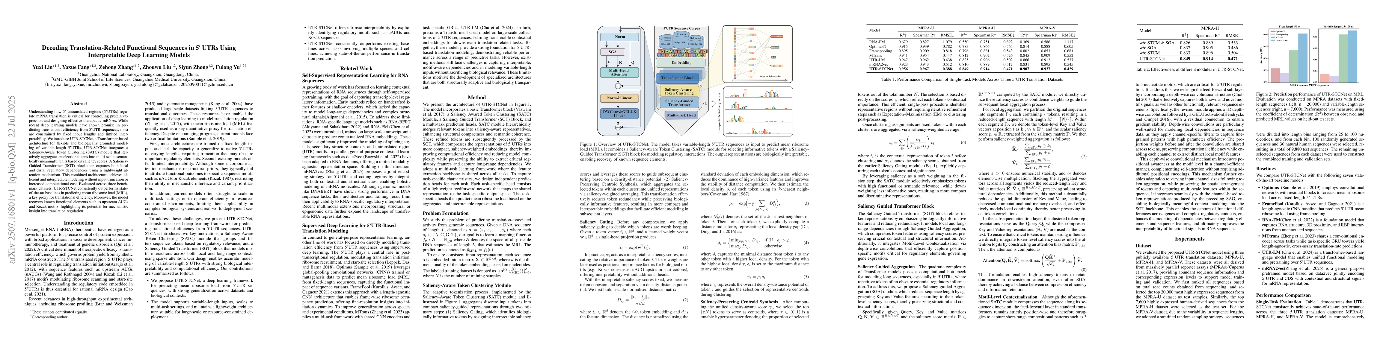 The research introduces UTR-STCNet, a Transformer-based architecture for modeling variable-length 5'UTRs, integrating a Saliency-Aware Token Clustering (SATC) module and a Saliency-Guided Transformer (SGT) block to capture regulatory dependencies efficiently and interpretably.