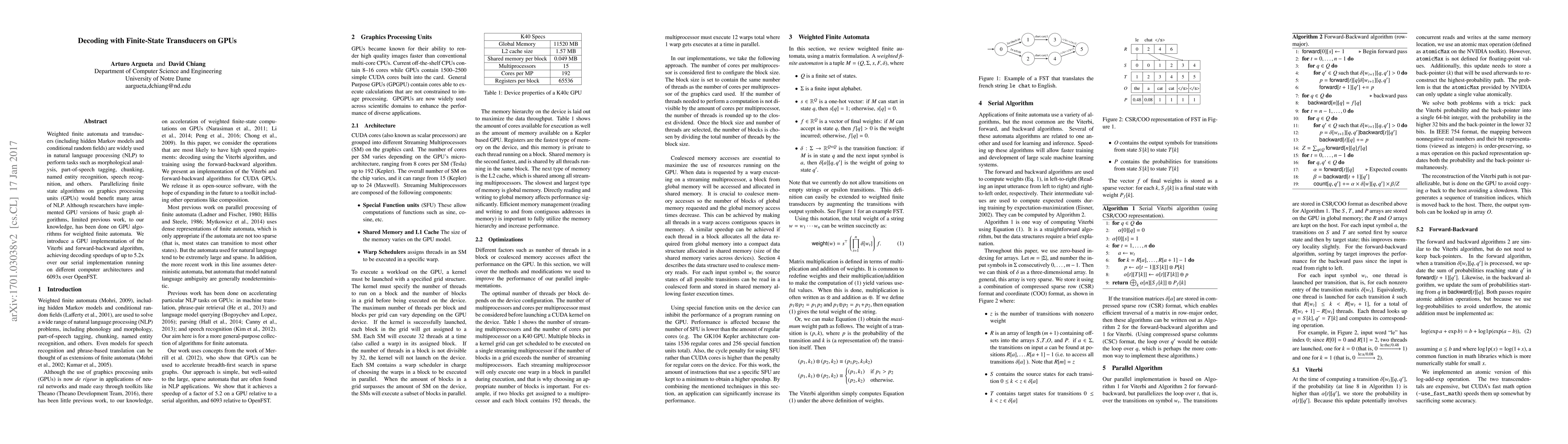 This paper presents a GPU implementation of the Viterbi and forward-backward algorithms for weighted finite automata, achieving significant speedups for natural language processing tasks such as speech recognition, up to 5.2x over serial implementations and 6093x over OpenFST.