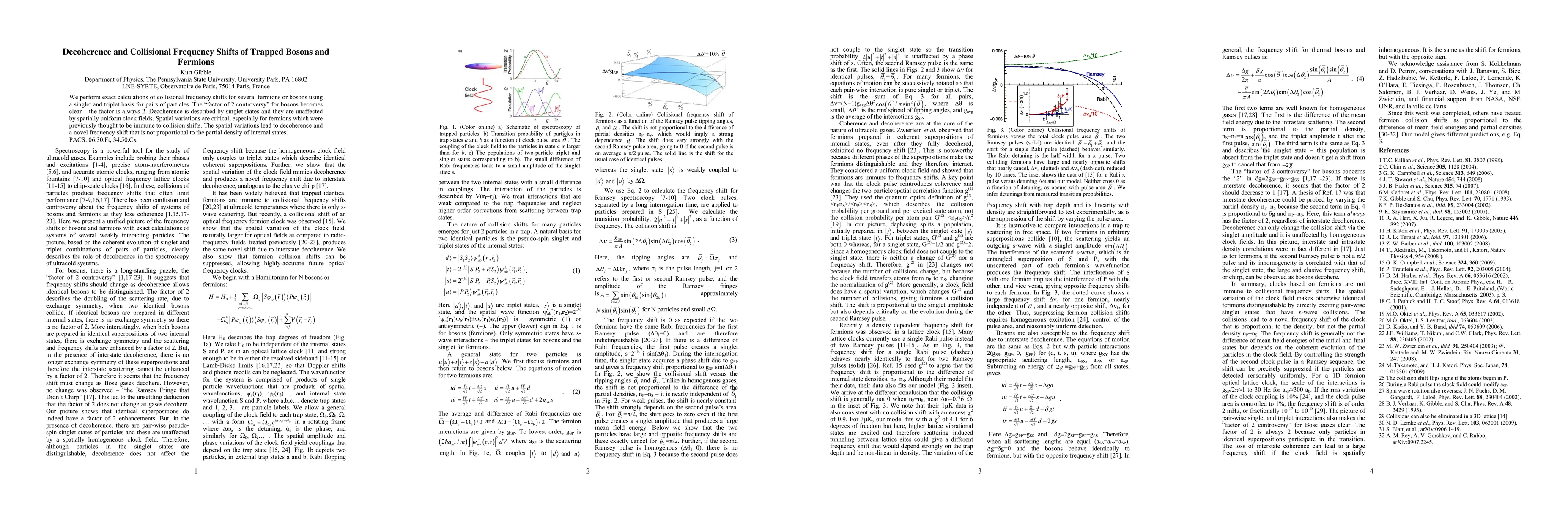 This study conducts precise calculations of collisional frequency shifts in trapped bosons and fermions, clarifying the "factor of 2 controversy" for bosons. It reveals that singlet states cause decoherence unaffected by uniform clock fields, while spatial variations induce novel frequency shifts, especially affecting fermions previously considered immune to collision shifts.