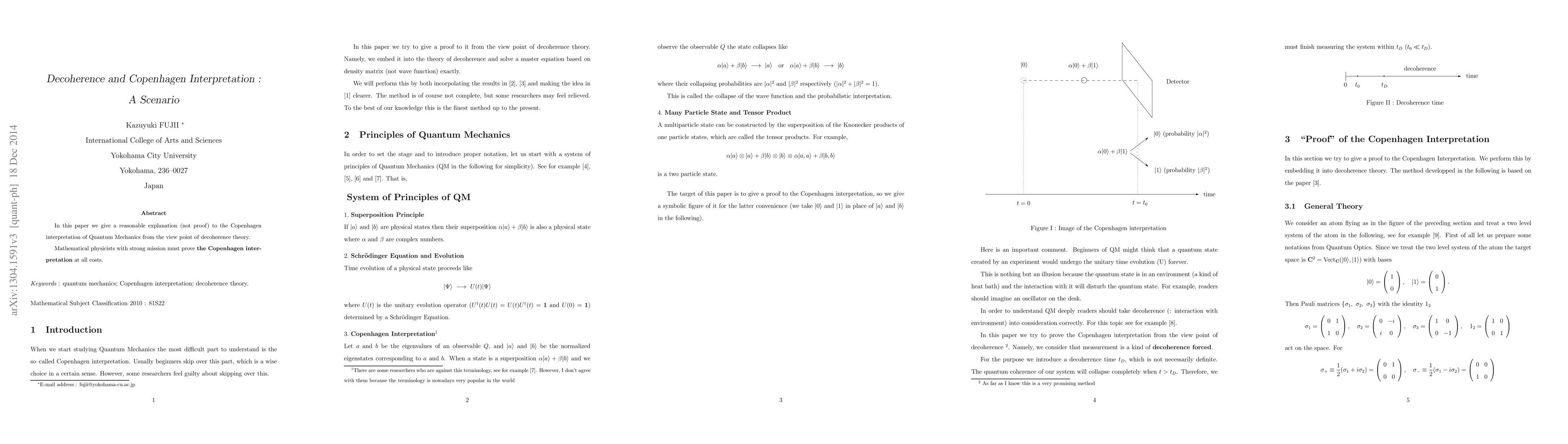 Summary: This paper offers a plausible explanation for the Copenhagen interpretation of Quantum Mechanics through the lens of decoherence theory, though it does not provide a formal proof. It emphasizes the necessity for mathematical physicists to rigorously validate the Copenhagen interpretation.