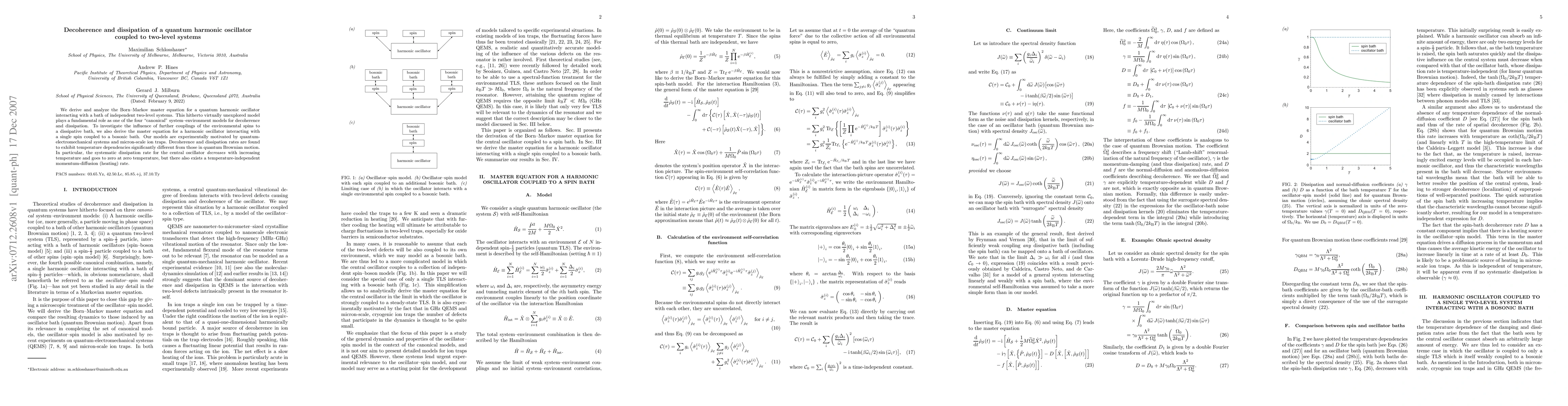 Derivation of master equations for a quantum harmonic oscillator coupled to both a bath of two-level systems and a single two-level system interacting with a bosonic bath, along with analysis of their temperature-dependent decoherence and dissipation rates.