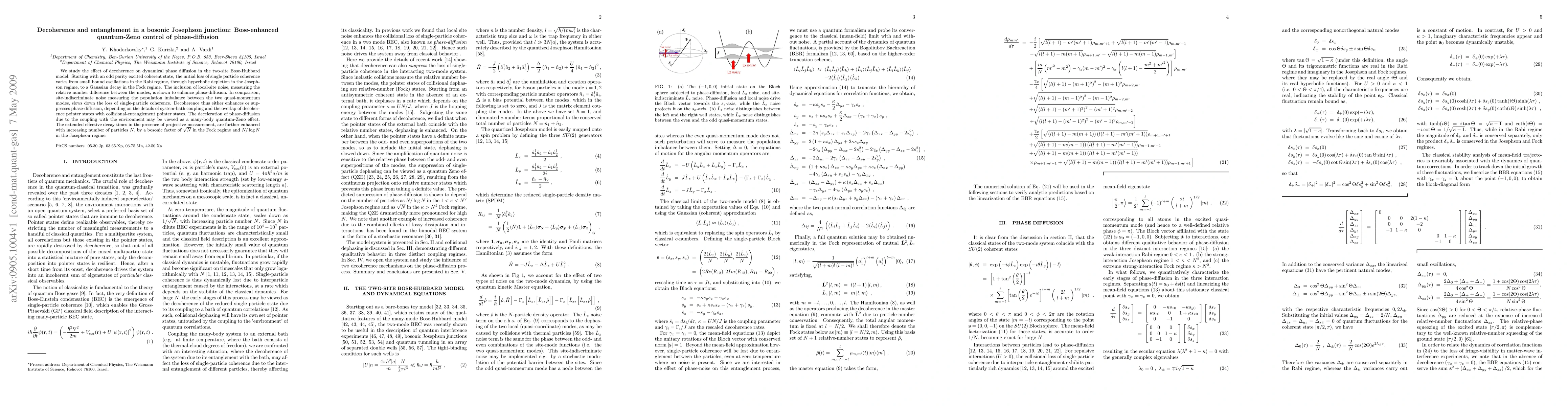 This paper investigates how decoherence influences phase diffusion in a bosonic Josephson junction modeled by the Bose-Hubbard Hamiltonian. It finds that local-site noise enhances phase-diffusion, while indiscriminate noise slows it down, leading to a many-body quantum-Zeno effect that is further amplified by the number of particles.