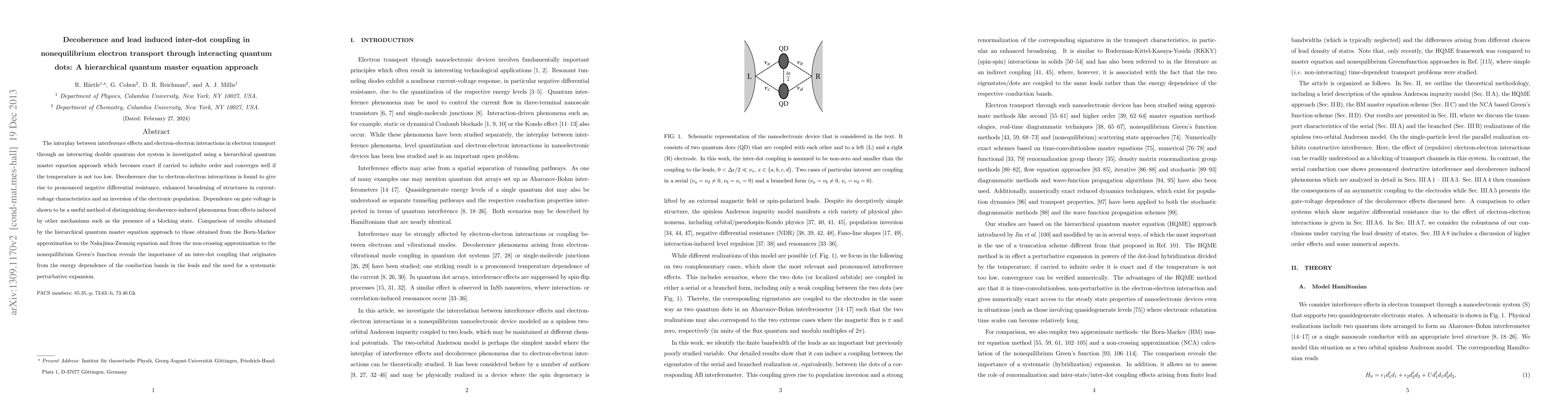 This paper investigates electron transport through a double quantum dot system using a hierarchical quantum master equation approach, finding that decoherence effects lead to negative differential resistance and population inversion. The study highlights the significance of inter-dot coupling and decoherence distinction through gate voltage dependency, comparing results with other theoretical methods.