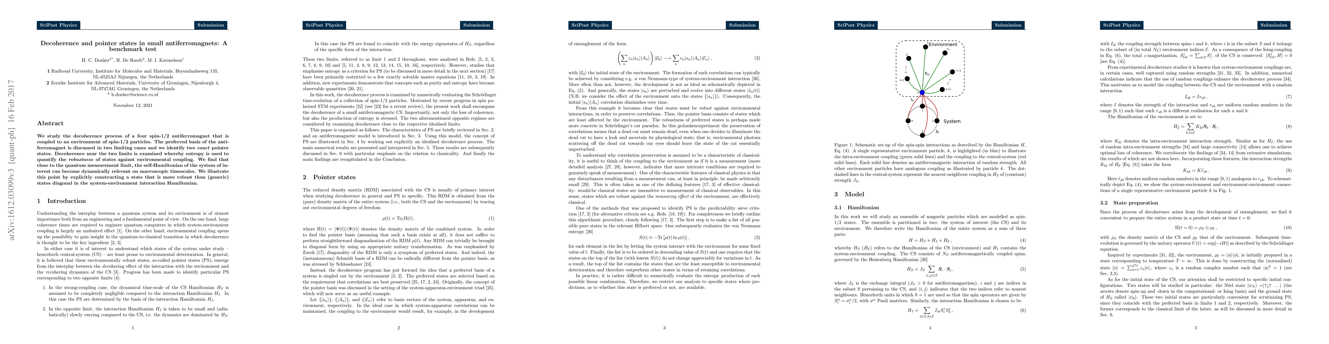 This paper investigates the decoherence process in a four spin-1/2 antiferromagnet coupled to an environment, identifying exact pointer states and examining their robustness against environmental coupling. It finds that near the quantum measurement limit, the system's self-Hamiltonian can dynamically influence the states, demonstrating a more robust state than those diagonal in the interaction Hamiltonian.