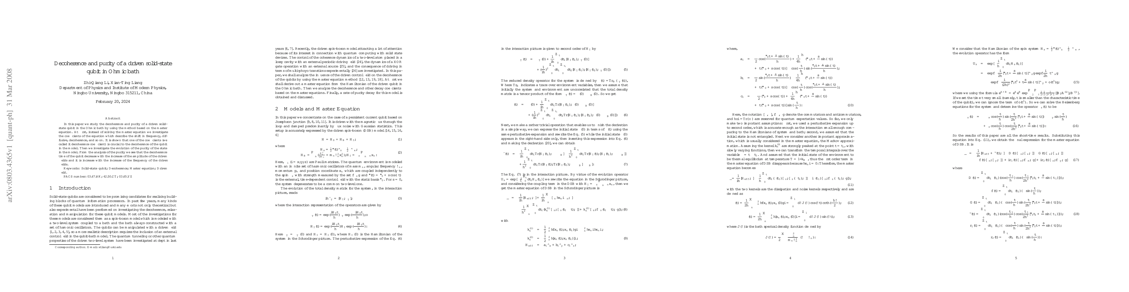 This paper investigates the decoherence and purity of a driven solid-state qubit in an Ohmic bath using a master equation approach. It identifies a crucial "decoherence coefficient" that significantly impacts qubit decoherence and finds that qubit purity evolution shows decoherence time decreases with higher driven field amplitudes and increases with higher driven field frequencies.