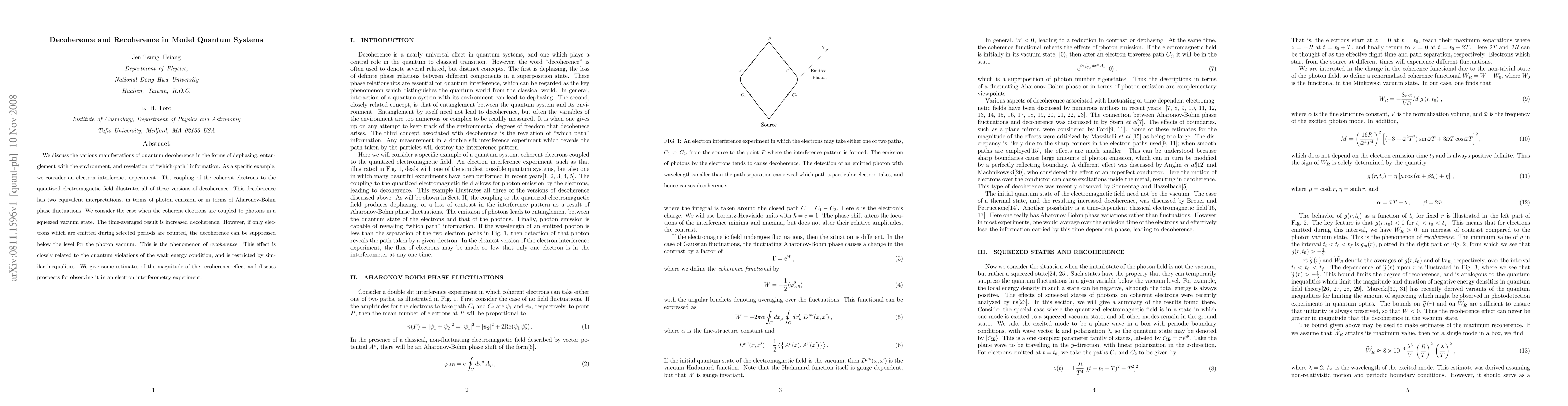 We discuss the various manifestations of quantum decoherence in the forms of dephasing, entanglement with the environment, and revelation of "which-path" information. As a specific example, we consider an electron interference experiment. The coupling of the coherent electrons to the quantized electromagnetic field illustrates all of these versions of decoherence. This decoherence has two equivalent interpretations, in terms of photon emission or in terms of Aharonov-Bohm phase fluctuations. We consider the case when the coherent electrons are coupled to photons in a squeezed vacuum state. The time-averaged result is increased decoherence. However, if only electrons which are emitted during selected periods are counted, the decoherence can be suppressed below the level for the photon vacuum. This is the phenomenon of recoherence. This effect is closely related to the quantum violations of the weak energy condition, and is restricted by similar inequalities. We give some estimates of the magnitude of the recoherence effect and discuss prospects for observing it in an electron interferometry experiment.
