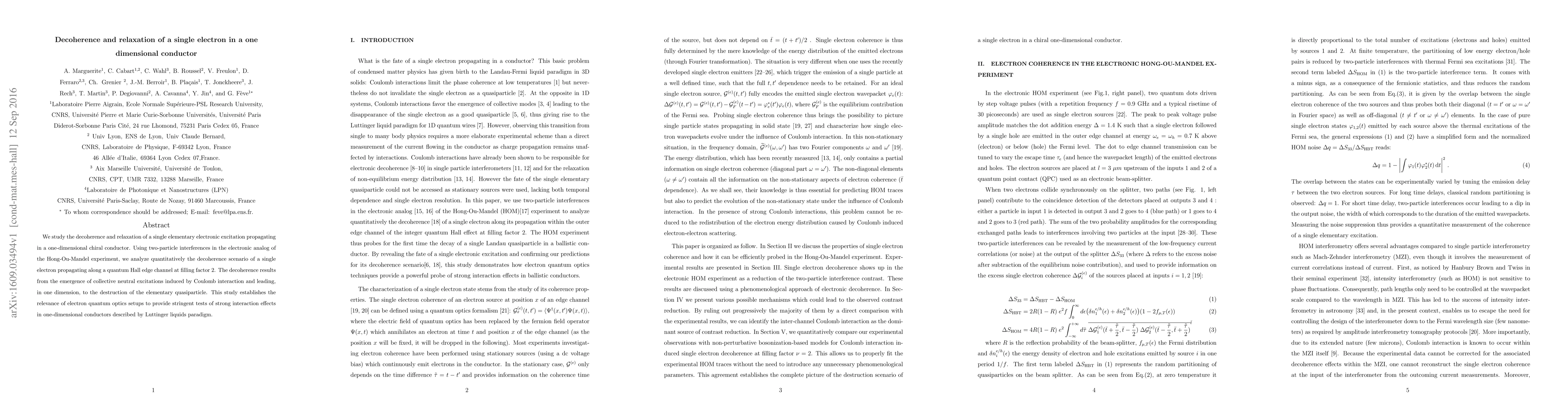 We study the decoherence and relaxation of a single elementary electronic excitation propagating in a one-dimensional chiral conductor. Using two-particle interferences in the electronic analog of the Hong-Ou-Mandel experiment, we analyze quantitatively the decoherence scenario of a single electron propagating along a quantum Hall edge channel at filling factor 2. The decoherence results from the emergence of collective neutral excitations induced by Coulomb interaction and leading, in one dimension, to the destruction of the elementary quasiparticle. This study establishes the relevance of electron quantum optics setups to provide stringent tests of strong interaction effects in one-dimensional conductors described by Luttinger liquids paradigm.