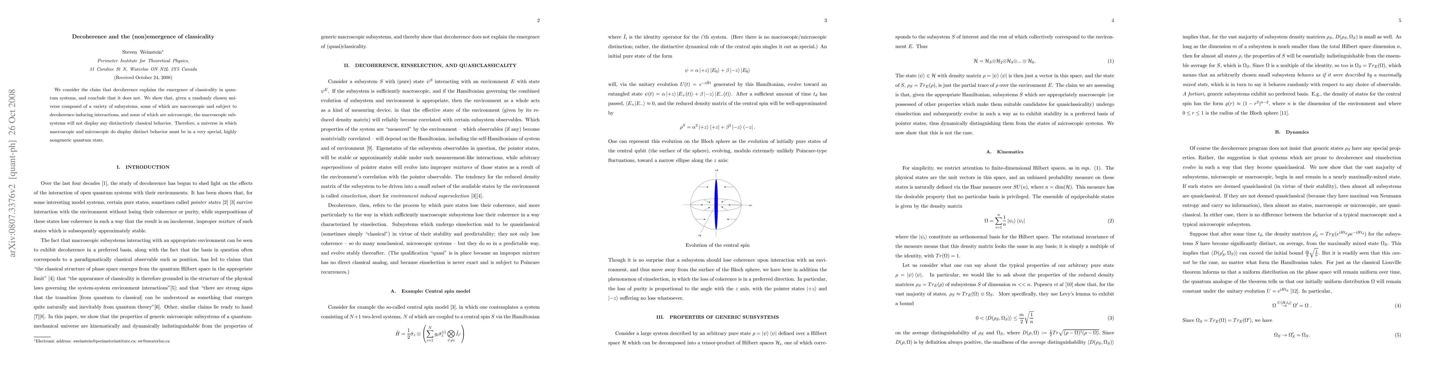 This paper argues that decoherence alone does not explain the emergence of classicality in quantum systems. It concludes that macroscopic subsystems in a randomly chosen universe will not exhibit distinctly classical behavior, implying that a universe with distinct macroscopic and microscopic behaviors must be in a highly special quantum state.