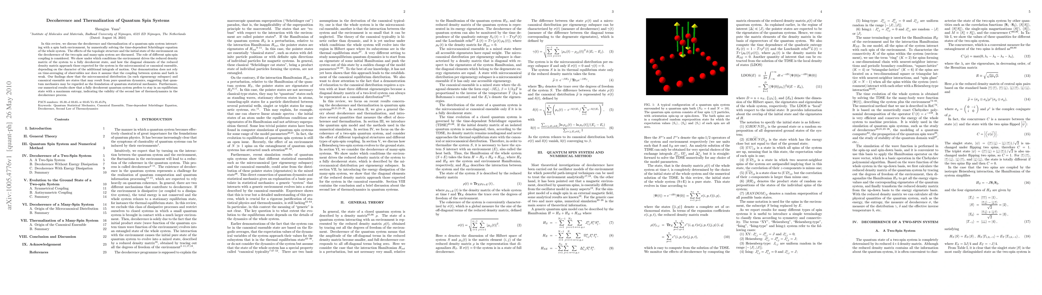 This review explores the decoherence and thermalization of quantum spin systems interacting with a spin bath, revealing how topological structure and initial states affect the process. It demonstrates that quantum mechanics can underpin quantum statistical mechanics, with pure quantum dynamics leading to microcanonical or canonical ensembles, and supports the second law of thermodynamics in the decoherence process.