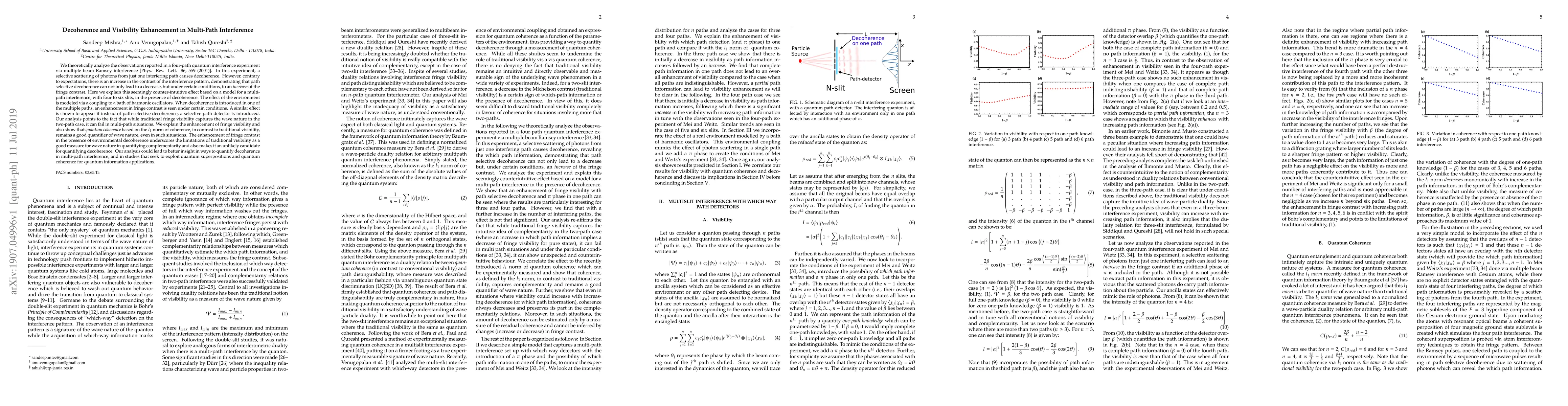 We theoretically analyze the observations reported in a four-path quantum interference experiment via multiple beam Ramsey interference [Phys. Rev. Lett. 86, 559 (2001)]. In this experiment, a selective scattering of photons from just one interfering path causes decoherence. However, contrary to expectations, there is an increase in the contrast of the interference pattern, demonstrating that path selective decoherence can not only lead to a decrease, but under certain conditions, to an increase of the fringe contrast. Here we explain this seemingly counter-intuitive effect based on a model for a multi-path interference, with four to six slits, in the presence of decoherence. The effect of the environment is modeled via a coupling to a bath of harmonic oscillators. When decoherence is introduced in one of the multiple paths, an enhancement in fringe contrast is seen under certain conditions. A similar effect is shown to appear if instead of path-selective decoherence, a selective path detector is introduced. Our analysis points to the fact that while traditional fringe visibility captures the wave nature in the two-path case, it can fail in multi-path situations. We explain the enhancement of fringe visibility and also show that quantum coherence based on the l1 norm of coherence, in contrast to traditional visibility, remains a good quantifier of wave nature, even in such situations. The enhancement of fringe contrast in the presence of environmental decoherence underscores the limitations of traditional visibility as a good measure for wave nature in quantifying complementarity and also makes it an unlikely candidate for quantifying decoherence. Our analysis could lead to better insight in ways to quantify decoherence in multi-path interference, and in studies that seek to exploit quantum superpositions and quantum coherence for quantum information applications.