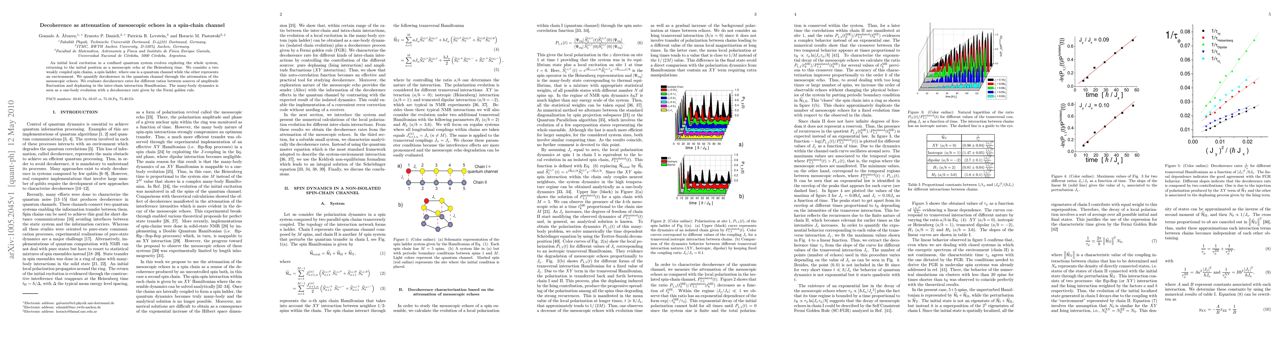 This paper investigates decoherence in a quantum spin-chain system by analyzing the attenuation of mesoscopic echoes in a spin ladder, where one chain acts as a quantum channel and the other as an environment. The study quantifies decoherence rates based on the balance between amplitude fluctuation and dephasing in the inter-chain interaction, revealing the dynamics through the Fermi golden rule.