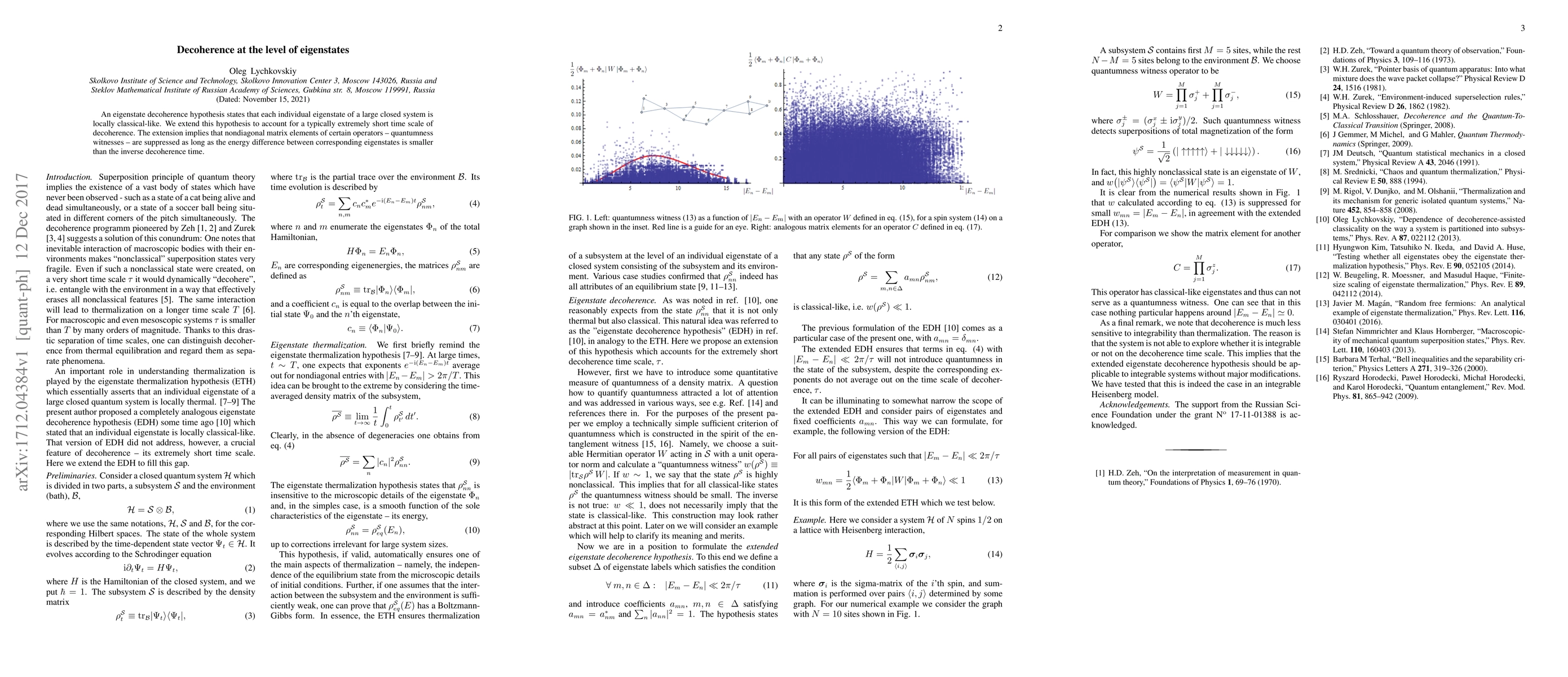 An eigenstate decoherence hypothesis states that each individual eigenstate of a large closed system is locally classical-like. We extend this hypothesis to account for a typically extremely short time scale of decoherence. The extension implies that nondiagonal matrix elements of certain operators - quantumness witnesses - are suppressed as long as the energy difference between corresponding eigenstates is smaller than the inverse decoherence time.