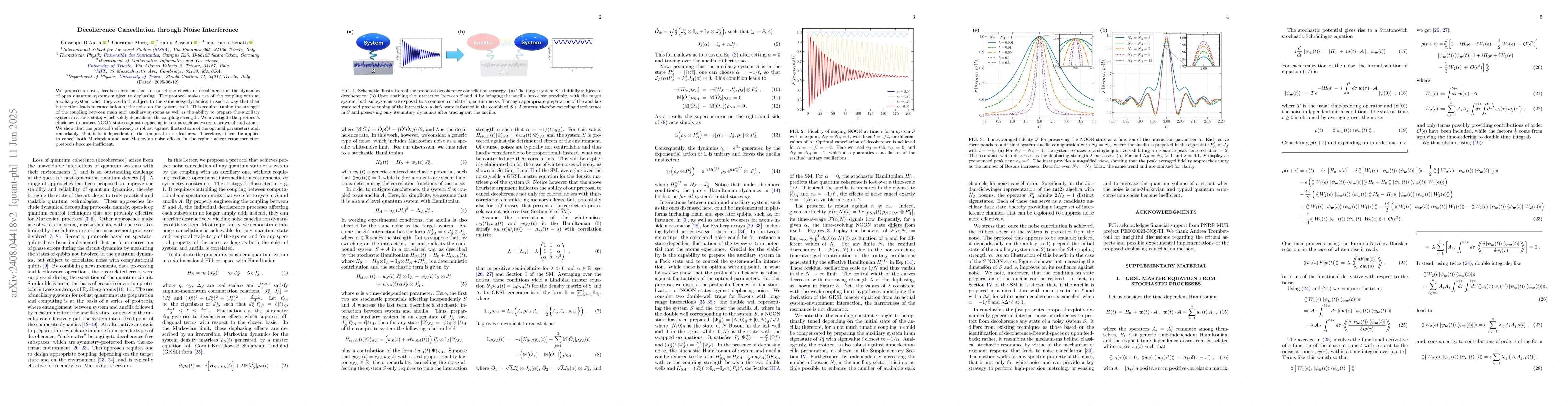 This research introduces a new method to counteract decoherence in quantum systems using an auxiliary system and noise interference, without feedback. The technique is shown to effectively protect NOON states in cold atom arrays, robust against parameter fluctuations and applicable to both Markovian and non-Markovian noise.