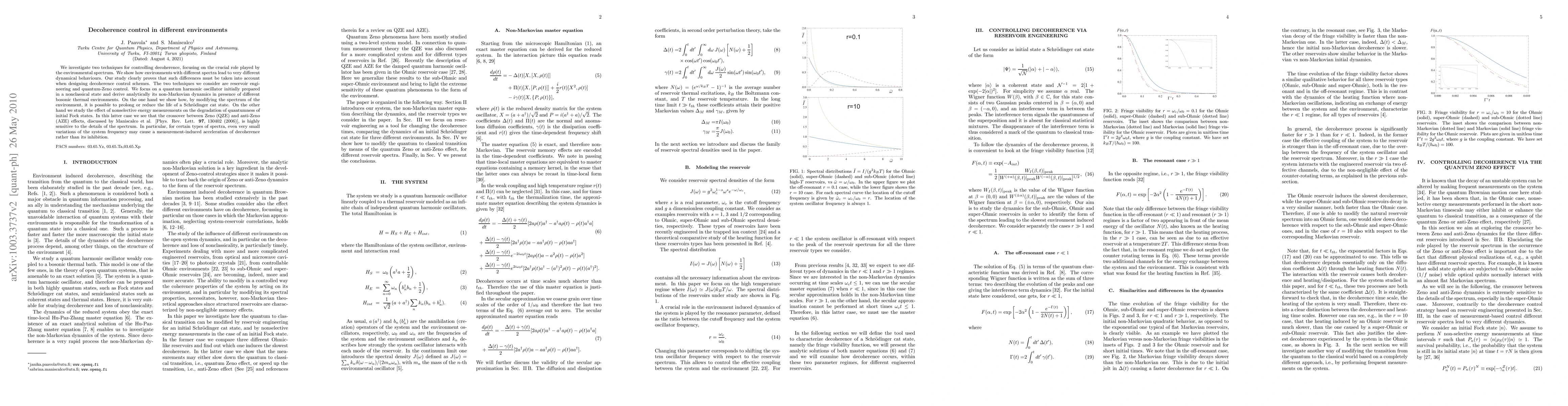 We investigate two techniques for controlling decoherence, focusing on the crucial role played by the environmental spectrum. We show how environments with different spectra lead to very different dynamical behaviours. Our study clearly proves that such differences must be taken into account when designing decoherence control schemes. The two techniques we consider are reservoir engineering and quantum-Zeno control. We focus on a quantum harmonic oscillator initially prepared in a nonclassical state and derive analytically its non-Markovian dynamics in presence of different bosonic thermal environments. On the one hand we show how, by modifying the spectrum of the environment, it is possible to prolong or reduce the life of a Schr\"odinger cat state. On the other hand we study the effect of nonselective energy measurements on the degradation of quantumness of initial Fock states. In this latter case we see that the crossover between Zeno (QZE) and anti-Zeno (AZE) effects, discussed by Maniscalco et al. [Phys. Rev. Lett. 97, 130402 (2006)], is highly sensitive to the details of the spectrum. In particular, for certain types of spectra, even very small variations of the system frequency may cause a measurement-induced acceleration of decoherence rather than its inhibition.