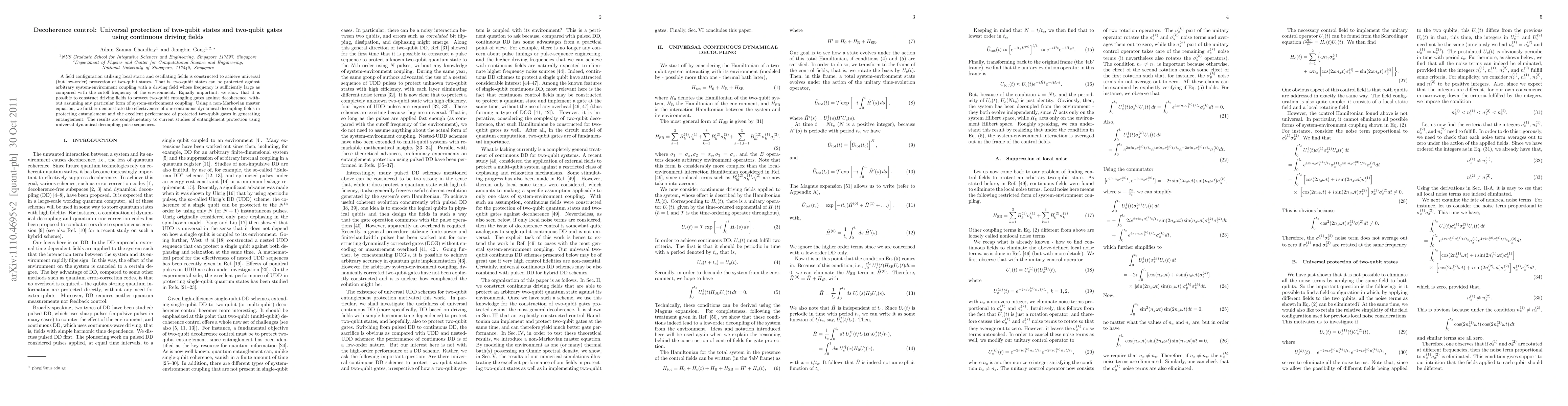 A field configuration utilizing local static and oscillating fields is constructed to achieve universal (but low-order) protection of two-qubit states. That is, two-qubit states can be protected against arbitrary system-environment coupling if the driving field frequency, as compared with the cutoff frequency of the environment, is sufficiently large. Equally important, we show that it is possible to construct driving fields to protect two-qubit entangling gates against decoherence, without assuming any particular form of system-environment coupling. Using a non-Markovian master equation, we further demonstrate the effectiveness of our continuous dynamical decoupling fields in protecting entanglement and the excellent performance of protected two-qubit gates in generating entanglement. The results are complementary to current studies of entanglement protection using universal dynamical decoupling pulse sequences.