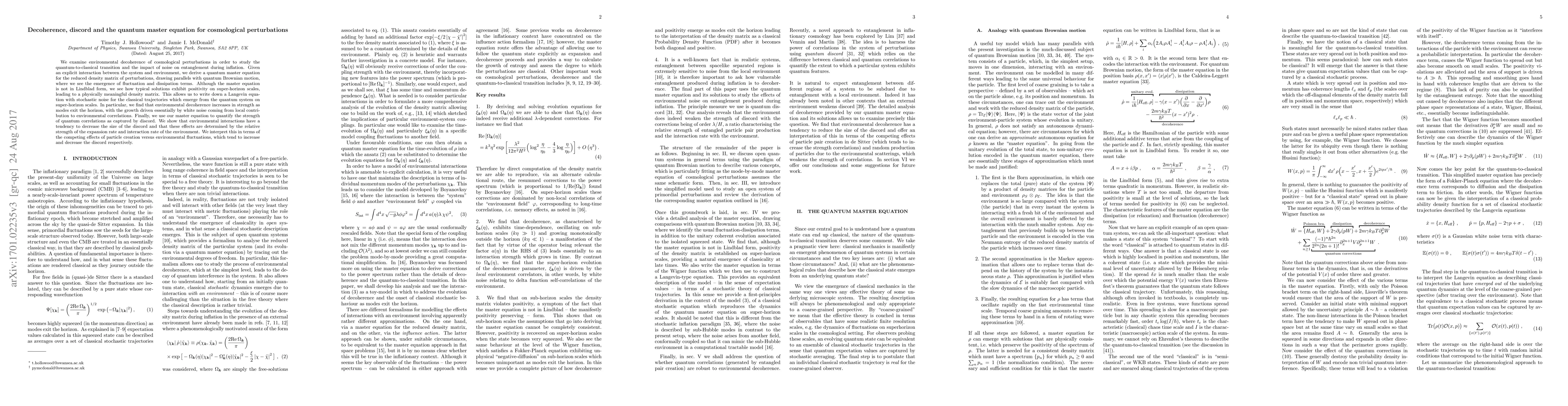 This paper explores the quantum-to-classical transition in cosmological perturbations through environmental decoherence, deriving a quantum master equation that parallels quantum Brownian motion. It finds that decoherence increases as perturbations exit the horizon, driven by white noise, and that environmental interactions tend to reduce quantum correlations, influenced by the balance between particle creation and environmental fluctuations.