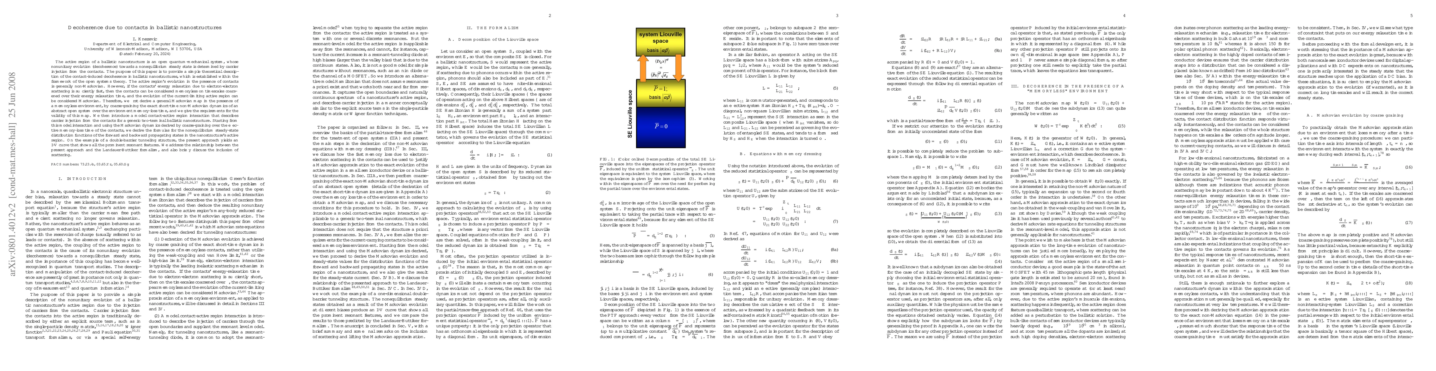 This paper presents a simplified theoretical model for understanding decoherence in ballistic nanostructures caused by contacts. It shows that under certain conditions, the contacts can be treated as memoryless, allowing for a Markovian description of the active region's evolution. The authors derive formulas for steady-state distribution functions of charge carriers and demonstrate their approach using a double-barrier tunneling structure, accurately reproducing its I-V curve features. The study also connects to the Landauer-Büttiker formalism and considers scattering.