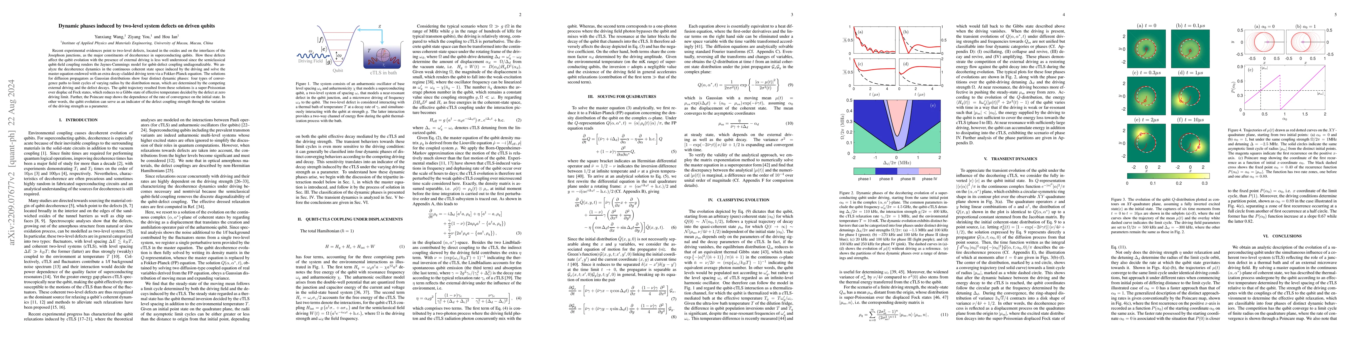 This paper investigates how two-level defects in superconducting qubits induce decoherence dynamics under external driving. The study finds that the resulting decoherence follows a Gaussian distribution in the quadrature plane with dynamic phases, converging to a limit cycle influenced by driving strength and defect decay rates.