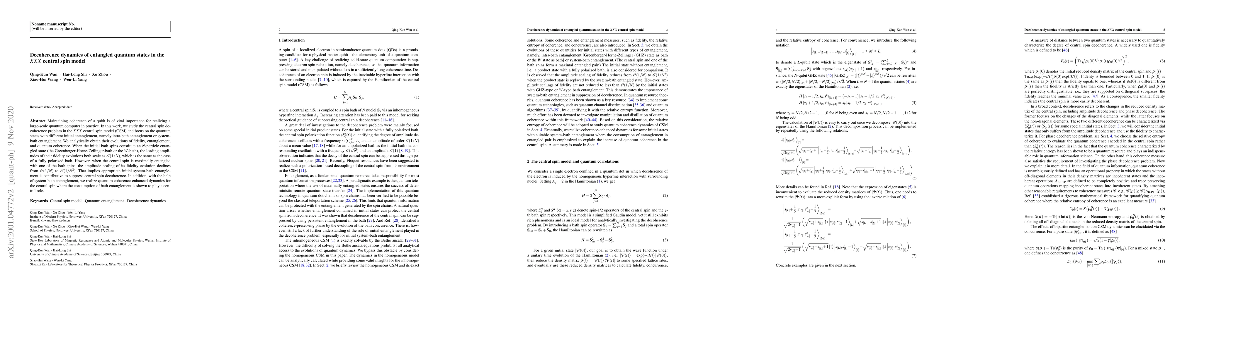 This paper investigates the decoherence dynamics of entangled quantum states in the $XXX$ central spin model, focusing on the fidelity, entanglement, and quantum coherence evolutions. It finds that initial system-bath entanglement can significantly suppress decoherence, transitioning the fidelity evolution from $\mathcal O(1/N)$ to $\mathcal O(1/N^2)$ and enabling quantum coherence-enhanced dynamics.