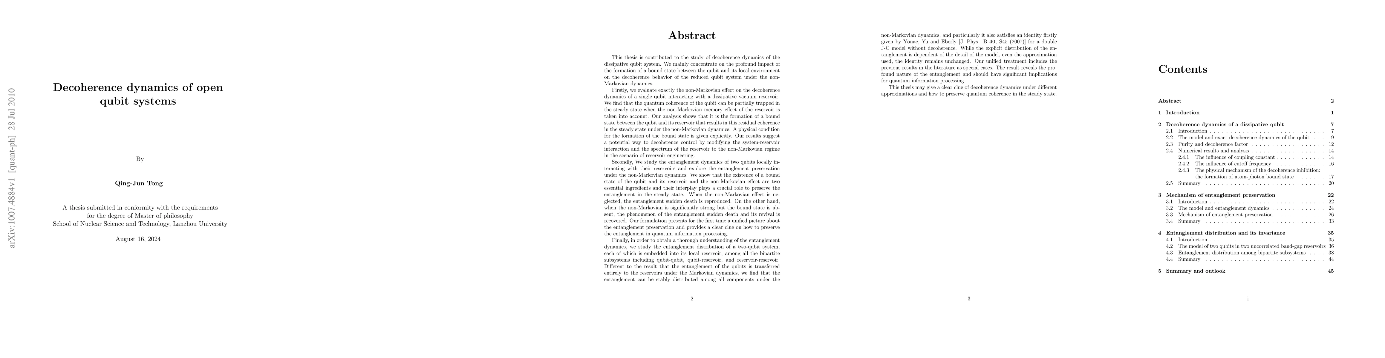 The paper presents a detailed analysis of non-Markovian decoherence dynamics in open qubit systems, revealing conditions under which decoherence can be suppressed and entanglement preserved.