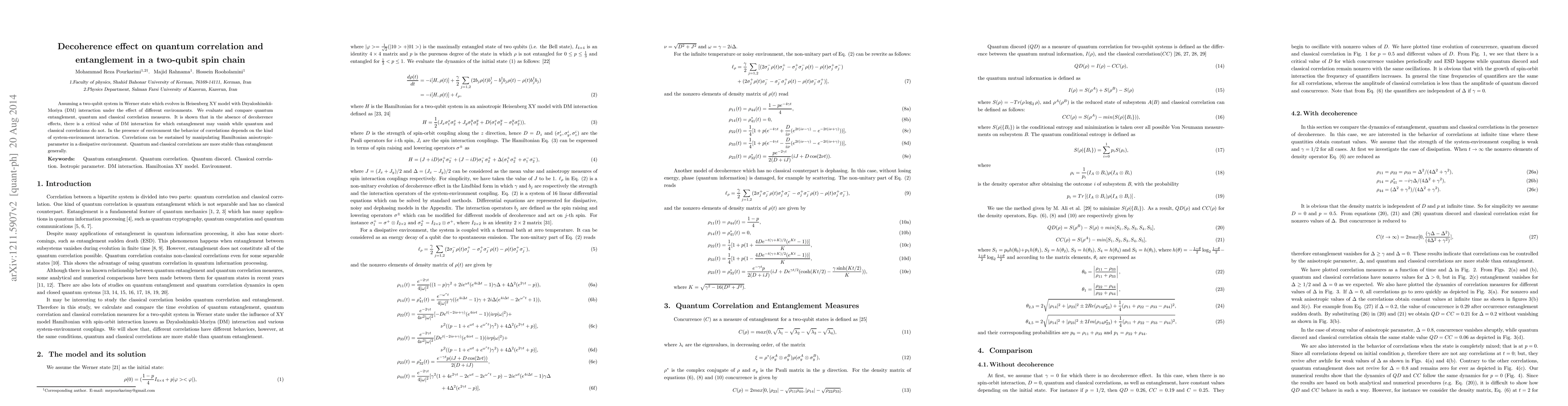 This paper investigates the impact of decoherence on quantum correlations and entanglement in a two-qubit spin chain under Heisenberg XY model with DM interaction. It finds that entanglement can vanish at a critical DM interaction value without affecting quantum and classical correlations, which are more stable and can be preserved by manipulating the Hamiltonian's anisotropic parameter in a dissipative environment.