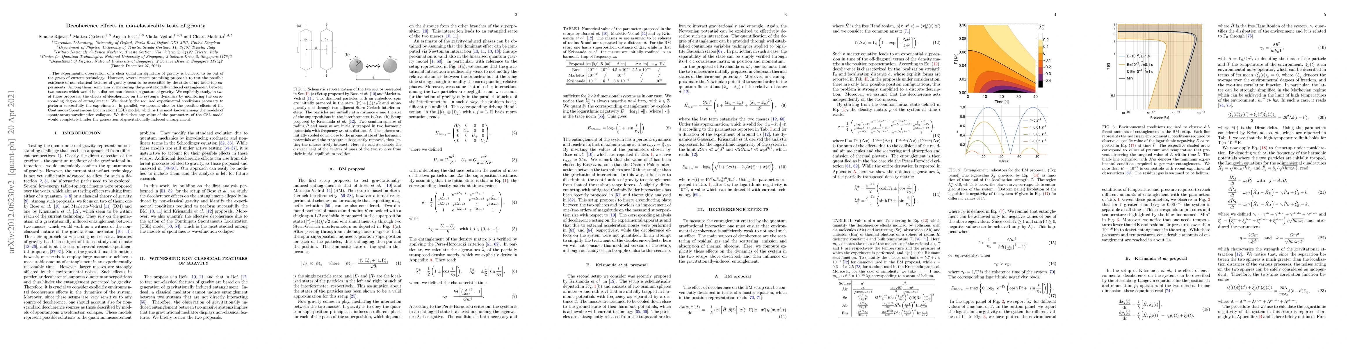 The research explicitly studies decoherence effects on gravitationally induced entanglement in two proposals for non-classicality tests of gravity, considering both environmental decoherence and the Continuous Spontaneous Localization (CSL) model.