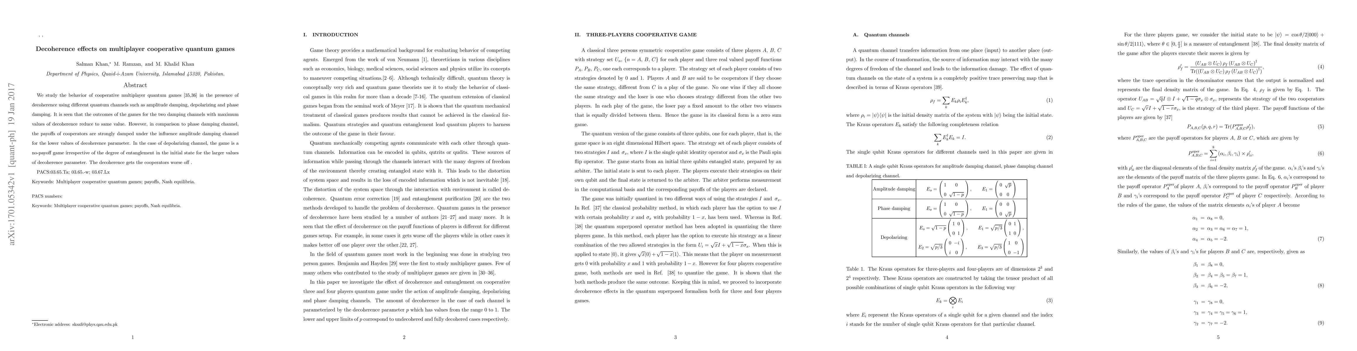 This paper examines how decoherence influences multiplayer cooperative quantum games through various quantum channels. It finds that while amplitude and phase damping channels both reduce game outcomes with high decoherence, amplitude damping significantly diminishes cooperators' payoffs at lower decoherence levels, while depolarizing channels lead to no-payoff games at higher decoherence levels.