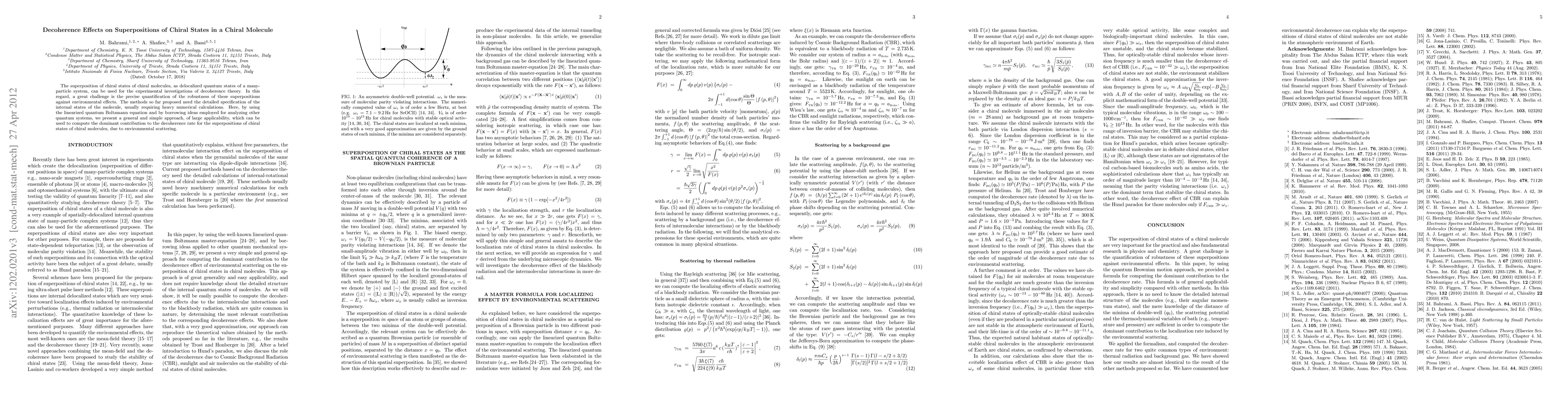 This paper proposes a simplified method using the linearized quantum Boltzmann equation to compute the decoherence rate for chiral states in chiral molecules, aiming to quantify the robustness of these superpositions against environmental effects without requiring detailed internal state specifications or heavy numerical calculations. The approach is presented as generally applicable for analyzing decoherence in such quantum systems.