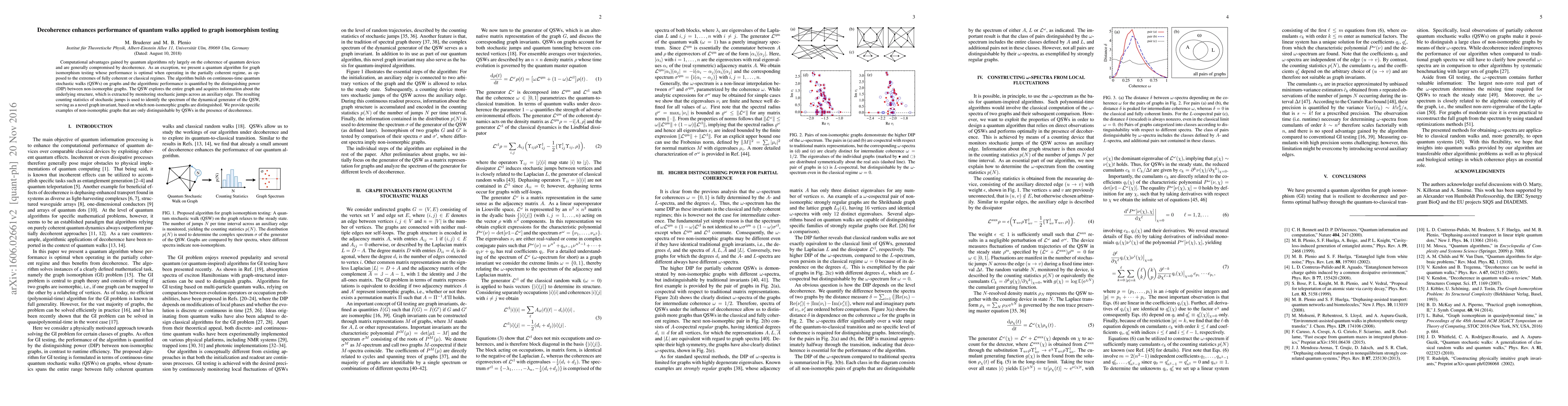 This paper demonstrates that decoherence can enhance the performance of quantum walks for graph isomorphism testing, showing optimal performance in the partially coherent regime. The algorithm leverages continuous-time quantum stochastic walks to explore graph structures and uses counting statistics of stochastic jumps to distinguish non-isomorphic graphs based on a novel graph invariant.