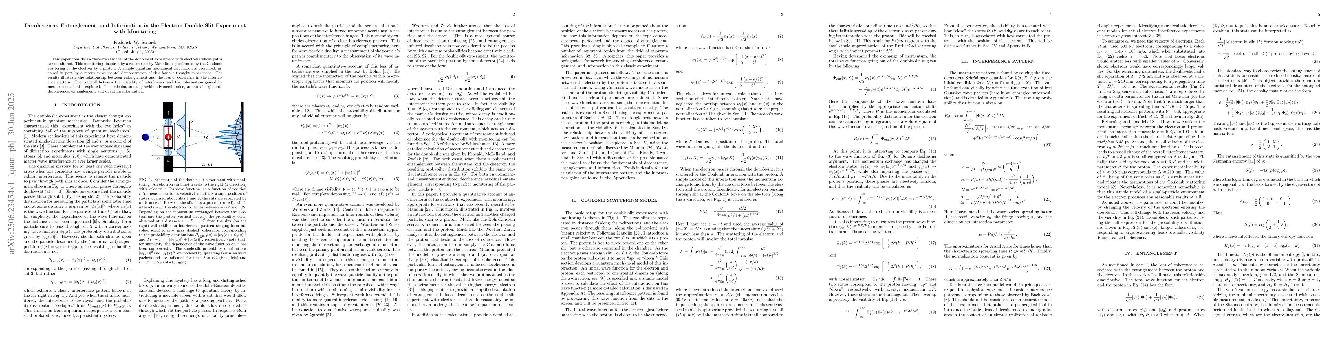 This paper considers a theoretical model of the double-slit experiment with electrons whose paths are monitored. This monitoring, inspired by a recent text by Maudlin, is performed by the Coulomb scattering of the electron by a proton. A simple quantum mechanical calculation is presented, inspired in part by a recent experimental demonstration of this famous thought experiment. The results illustrate the relationship between entanglement and the loss of coherence in the interference pattern. The tradeoff between the visibility of interference and the information gained by measurement is also explored. This calculation can provide advanced undergraduates insight into decoherence, entanglement, and quantum information.