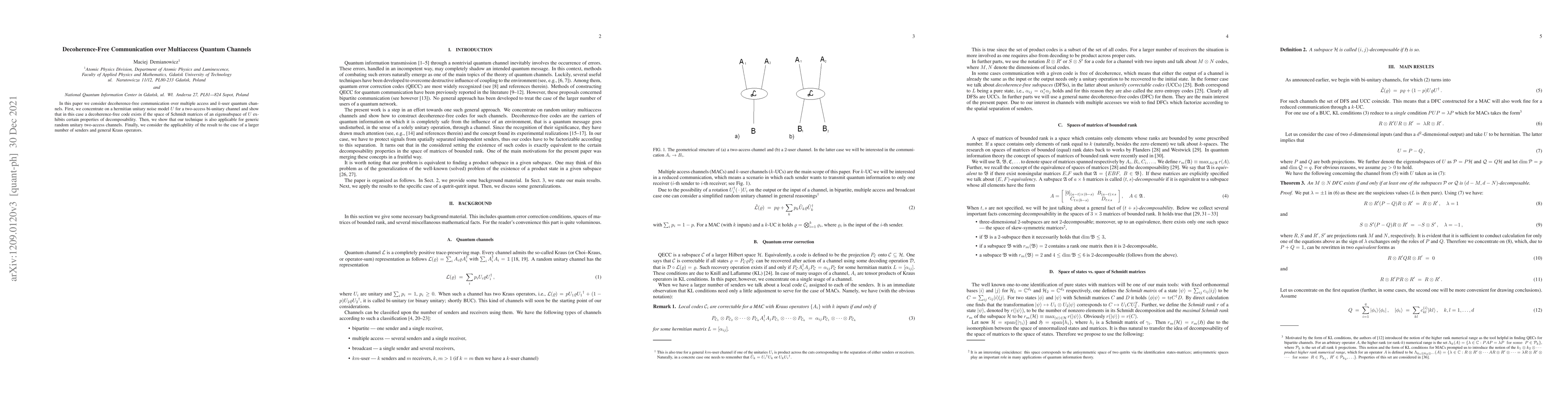 In this paper we consider decoherence-free communication over multiple access and $k$-user quantum channels. First, we concentrate on a hermitian unitary noise model $U$ for a two-access bi-unitary channel and show that in this case a decoherence-free code exists if the space of Schmidt matrices of an eigensubspace of $U$ exhibits certain properties of decomposability. Then, we show that our technique is also applicable for generic random unitary two-access channels. Finally, we consider the applicability of the result to the case of a larger number of senders and general Kraus operators.