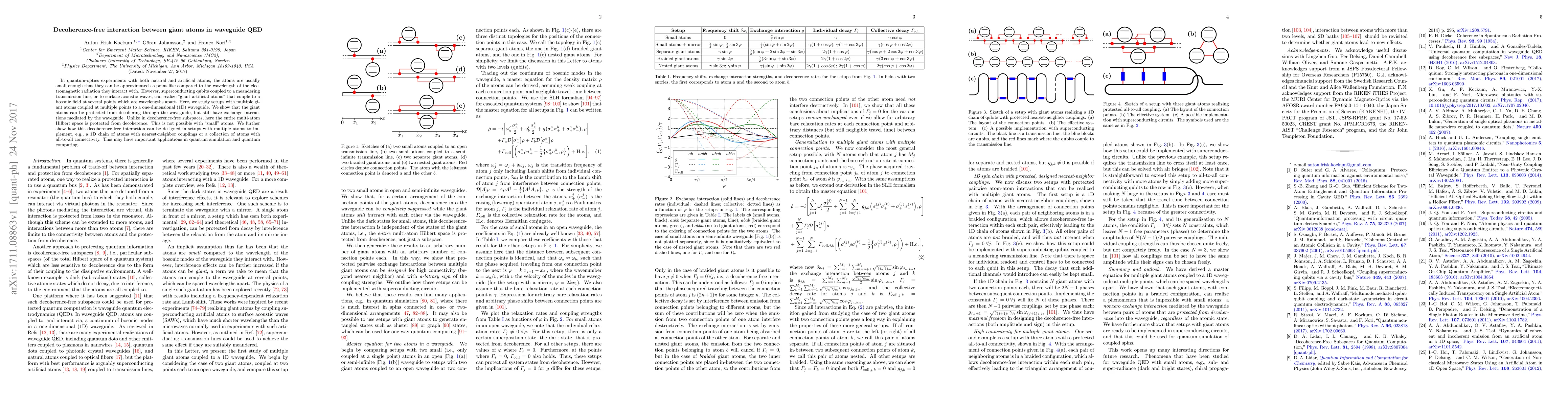 In quantum-optics experiments with both natural and artificial atoms, the atoms are usually small enough that they can be approximated as point-like compared to the wavelength of the electromagnetic radiation they interact with. However, superconducting qubits coupled to a meandering transmission line, or to surface acoustic waves, can realize "giant artificial atoms" that couple to a bosonic field at several points which are wavelengths apart. Here, we study setups with multiple giant atoms coupled at multiple points to a one-dimensional (1D) waveguide. We show that the giant atoms can be protected from decohering through the waveguide, but still have exchange interactions mediated by the waveguide. Unlike in decoherence-free subspaces, here the entire multi-atom Hilbert space is protected from decoherence. This is not possible with "small" atoms. We further show how this decoherence-free interaction can be designed in setups with multiple atoms to implement, e.g., a 1D chain of atoms with nearest-neighbor couplings or a collection of atoms with all-to-all connectivity. This may have important applications in quantum simulation and quantum computing.