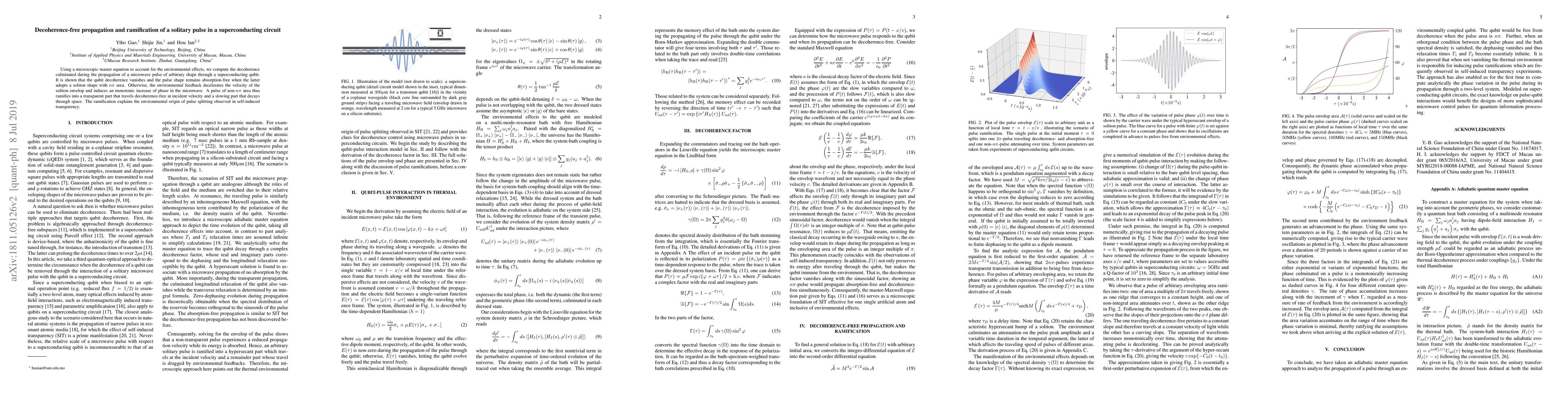 Using a microscopic master equation to account for the environmental effects, we compute the decoherence culminated during the propagation of a microwave pulse of arbitrary shape through a superconducting qubit. It is shown that the qubit decoherence vanishes and the pulse shape remains absorption-free when the latter adopts a soliton shape with $n\pi$ area. Otherwise, the environmental feedback decelerates the velocity of the soliton envelop and induces an monotonic increase of phase in the microwave. A pulse of non-$n\pi$ area thus ramifies into a transparent part that travels decoherence-free at incident velocity and a slowing part that decays through space. The ramification explains the environmental origin of pulse splitting observed in self-induced transparency.