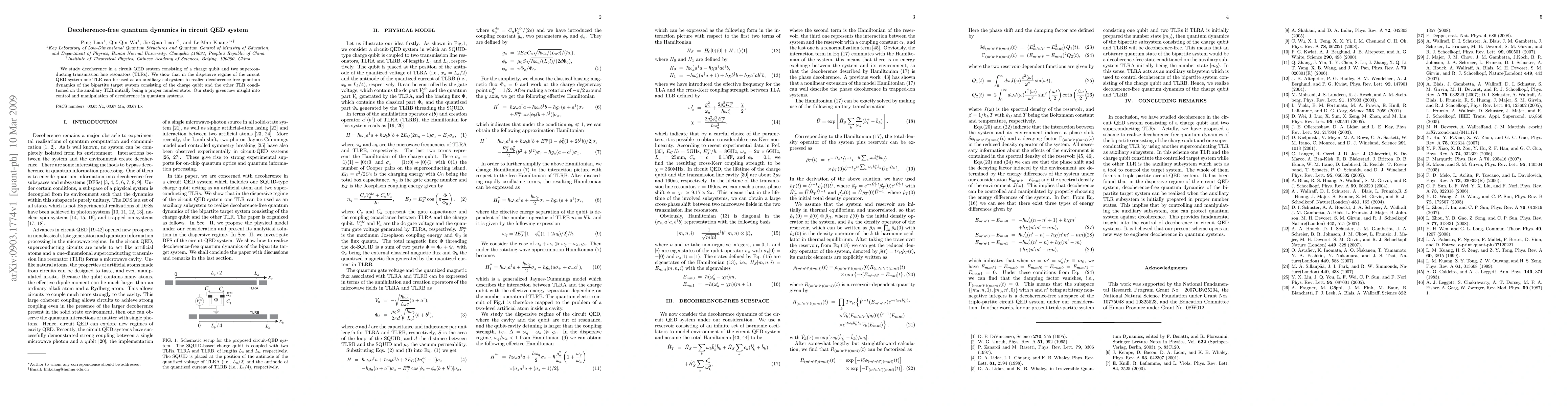 This paper investigates decoherence in a circuit QED system with a charge qubit and two transmission line resonators, demonstrating that one resonator can serve as an auxiliary subsystem to achieve decoherence-free quantum dynamics in the target system, offering new insights into quantum decoherence control.