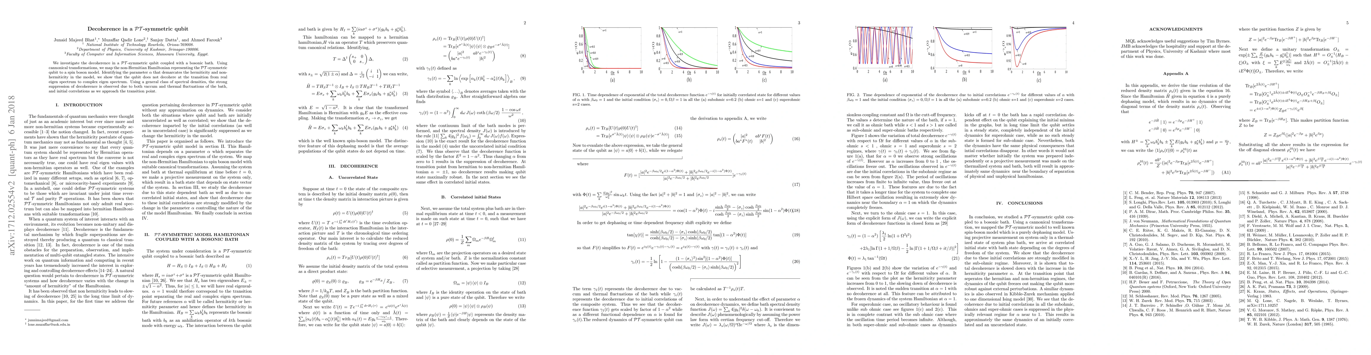 This paper explores decoherence in a $\mathcal{PT}$-symmetric qubit interacting with a bosonic bath, demonstrating that the qubit remains coherent at the transition from real to complex eigenspectrum, with strong suppression of decoherence due to vacuum and thermal fluctuations. The study uses canonical transformations to map the non-Hermitian Hamiltonian to a spin boson model.