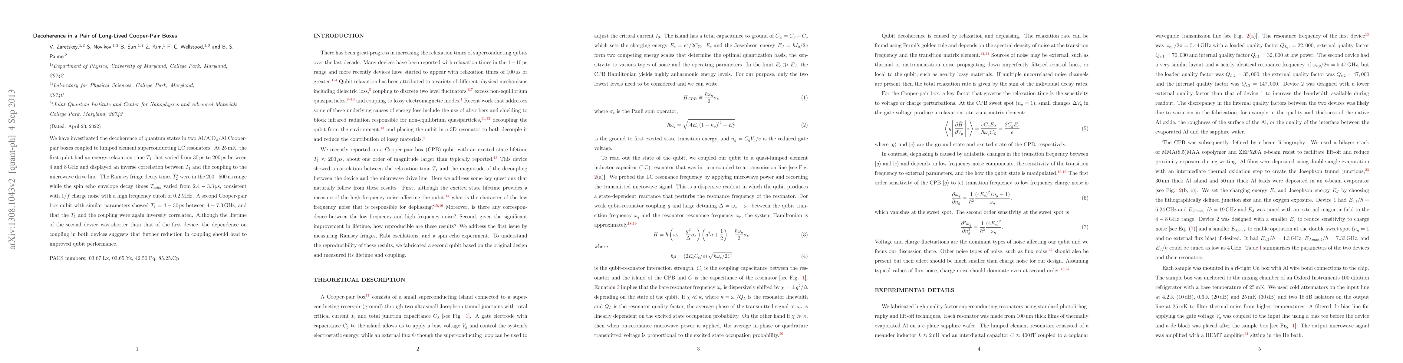 We have investigated the decoherence of quantum states in two Al/AlOx/Al Cooper-pair boxes coupled to lumped element superconducting LC resonators. At 25 mK, the first qubit had an energy relaxation time T1 that varied from 30 us to 200 us between 4 and 8 GHz and displayed an inverse correlation between T1 and the coupling to the microwave drive line. The Ramsey fringe decay times T2* were in the 200-500 ns range while the spin echo envelope decay times Techo varied from 2.4-3.3 us, consistent with 1/f charge noise with a high frequency cutoff of 0.2 MHz. A second Cooper-pair box qubit with similar parameters showed T1=4-30 us between 4-7.3 GHz, and that the T1 and the coupling were again inversely correlated. Although the lifetime of the second device was shorter than that of the first device, the dependence on coupling in both devices suggests that further reduction in coupling should lead to improved qubit performance.