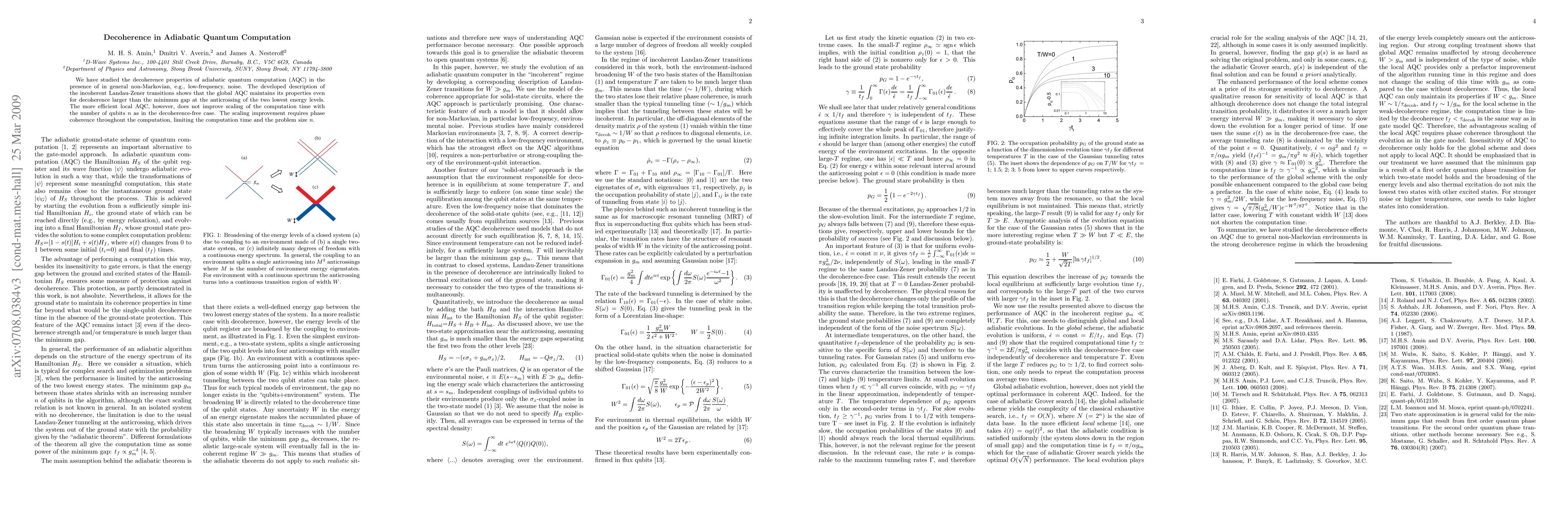 Summary: The study examines decoherence in adiabatic quantum computation (AQC) under non-Markovian noise, revealing that global AQC retains properties despite high decoherence levels, while local AQC fails to improve scaling with qubit count due to the necessity of phase coherence for computation efficiency.