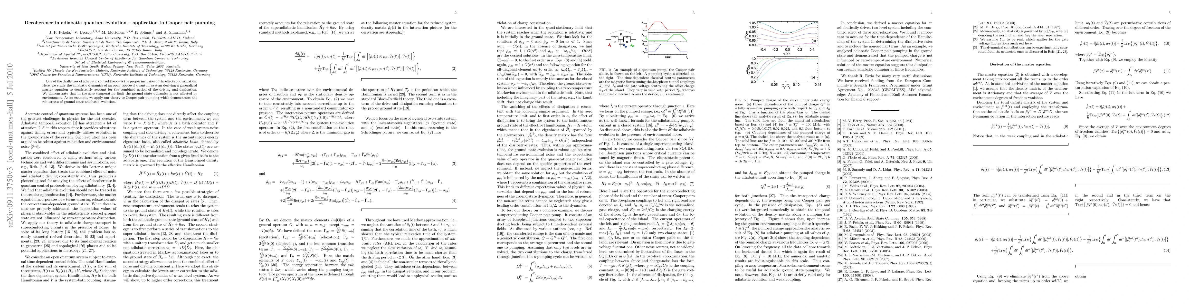 This paper develops a generalized master equation to incorporate dissipation effects in adiabatic quantum evolution, showing that ground state dynamics remain unaffected in the zero temperature limit. The theory is applied to Cooper pair pumping, illustrating the robustness of adiabatic evolution despite environmental influences.
