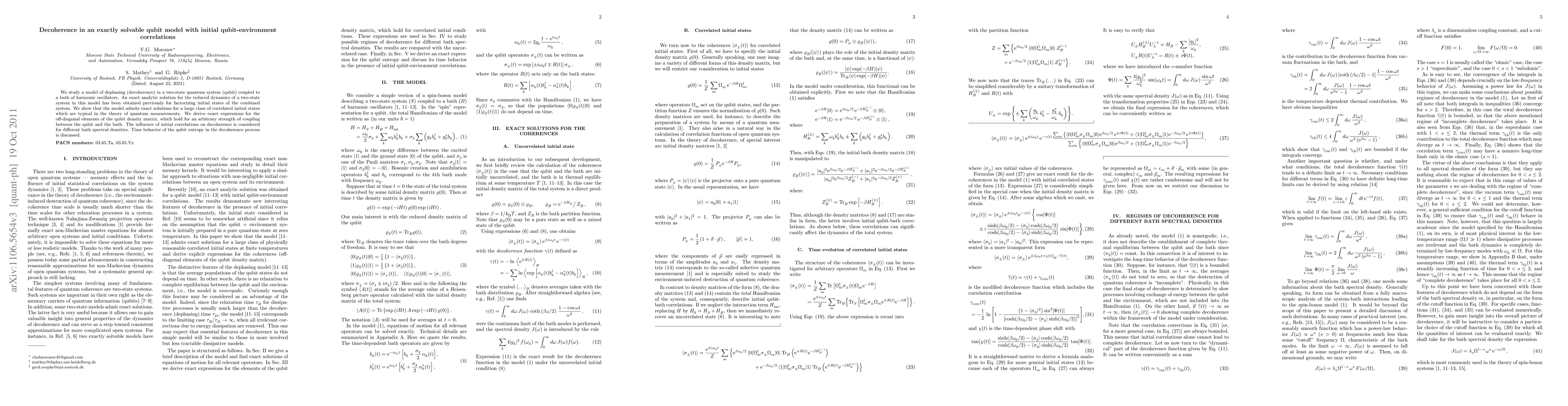 This paper investigates a solvable qubit model with initial qubit-environment correlations, deriving exact solutions for decoherence dynamics under various coupling strengths. The study reveals the impact of initial correlations on decoherence and analyzes the time behavior of qubit entropy.