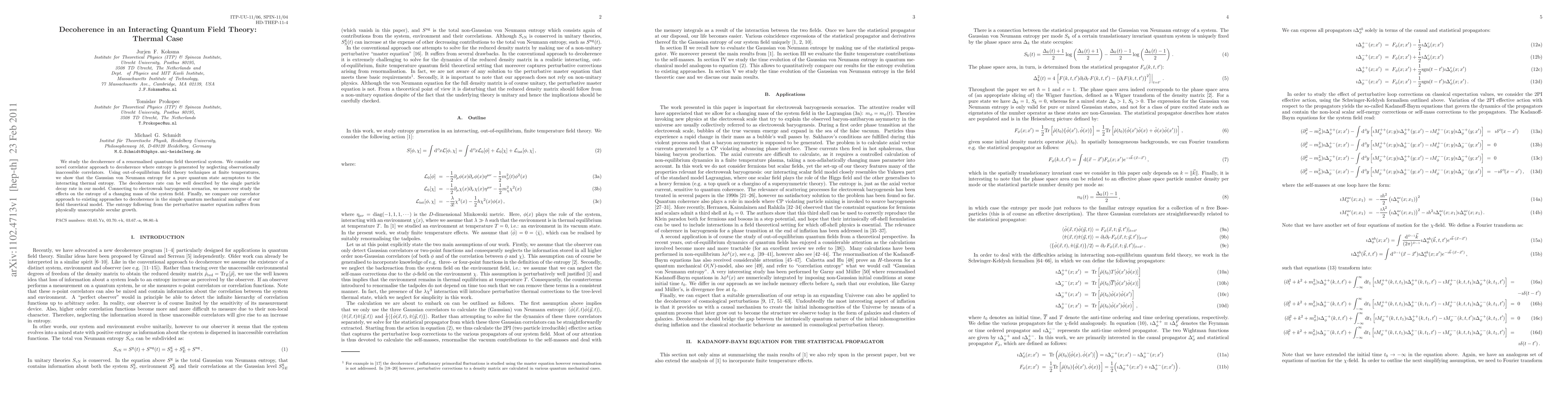 We study the decoherence of a renormalised quantum field theoretical system. We consider our novel correlator approach to decoherence where entropy is generated by neglecting observationally inaccessible correlators. Using out-of-equilibrium field theory techniques at finite temperatures, we show that the Gaussian von Neumann entropy for a pure quantum state asymptotes to the interacting thermal entropy. The decoherence rate can be well described by the single particle decay rate in our model. Connecting to electroweak baryogenesis scenarios, we moreover study the effects on the entropy of a changing mass of the system field. Finally, we compare our correlator approach to existing approaches to decoherence in the simple quantum mechanical analogue of our field theoretical model. The entropy following from the perturbative master equation suffers from physically unacceptable secular growth.