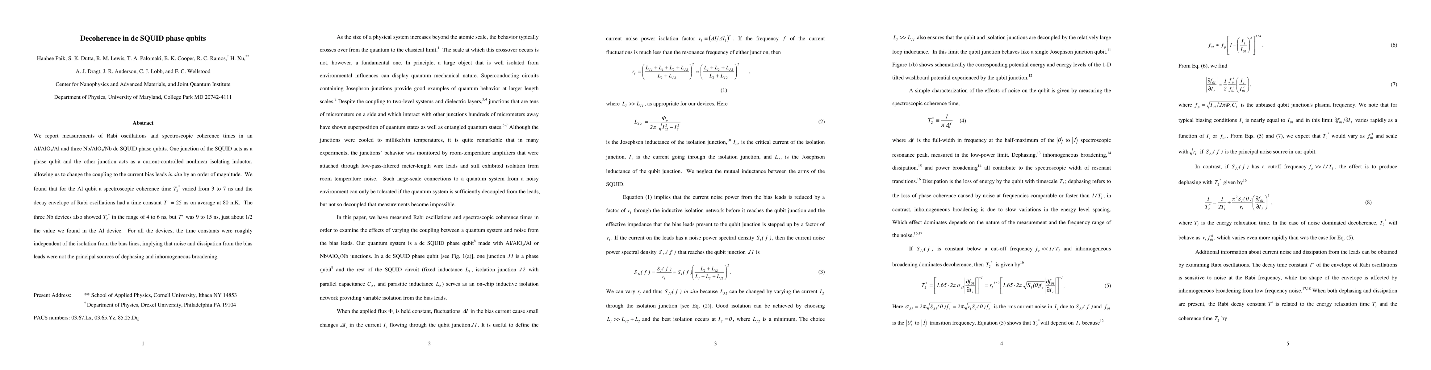 We report measurements of Rabi oscillations and spectroscopic coherence times in an Al/AlOx/Al and three Nb/AlOx/Nb dc SQUID phase qubits. One junction of the SQUID acts as a phase qubit and the other junction acts as a current-controlled nonlinear isolating inductor, allowing us to change the coupling to the current bias leads in situ by an order of magnitude. We found that for the Al qubit a spectroscopic coherence time T2* varied from 3 to 7 ns and the decay envelope of Rabi oscillations had a time constant T' = 25 ns on average at 80 mK. The three Nb devices also showed T2* in the range of 4 to 6 ns, but T' was 9 to 15 ns, just about 1/2 the value we found in the Al device. For all the devices, the time constants were roughly independent of the isolation from the bias lines, implying that noise and dissipation from the bias leads were not the principal sources of dephasing and inhomogeneous broadening.