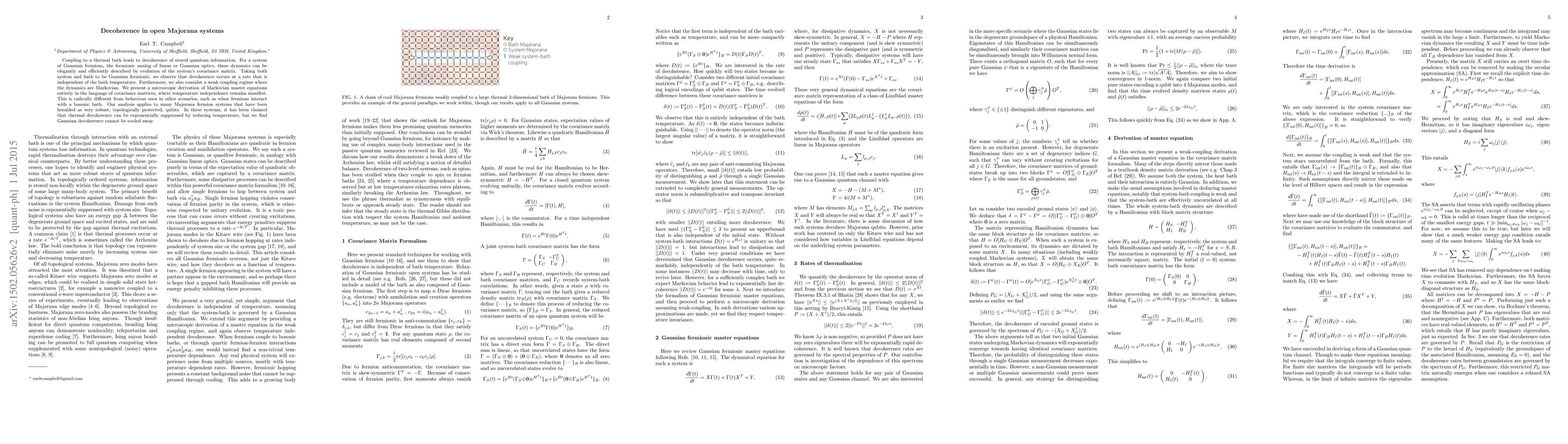 Coupling to a thermal bath leads to decoherence of stored quantum information. For a system of Gaussian fermions, the fermionic analog of linear or Gaussian optics, these dynamics can be elegantly and efficiently described by evolution of the system's covariance matrix. Taking both system and bath to be Gaussian fermionic, we observe that decoherence occurs at a rate that is independent of the bath temperature. Furthermore, we also consider a weak coupling regime where the dynamics are Markovian. We present a microscopic derivation of Markovian master equations entirely in the language of covariance matrices, where temperature independence remains manifest. This is radically different from behaviour seen in other scenarios, such as when fermions interact with a bosonic bath. Our analysis applies to many Majorana fermion systems that have been heralded as very robust, topologically protected, qubits. In these systems, it has been claimed that thermal decoherence can be exponentially suppressed by reducing temperature, but we find Gaussian decoherence cannot be cooled away.