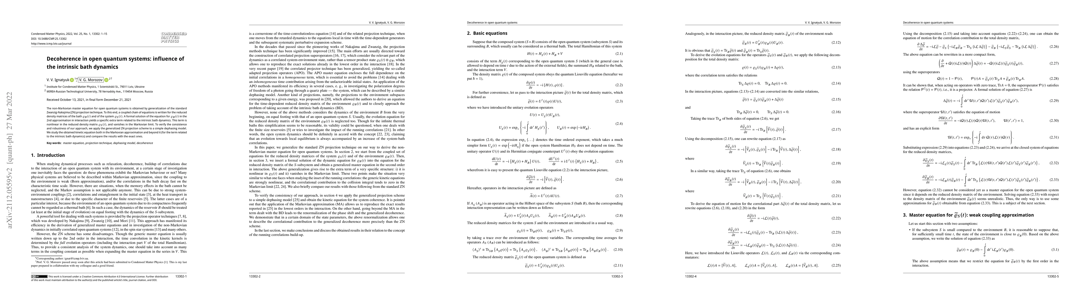 The non-Markovian master equation for open quantum systems is obtained by generalization of the standard Zwanzig-Nakajima (ZN) projection technique. To this end, a coupled chain of equations for the reduced density matrices of the bath $\varrho_{B}(t)$ and of the system $\varrho_{S}(t)$ are written. Formal solution of the equation for $\varrho_{B}(t)$ in the 2-nd approximation in interaction yields a specific extra term, related to the intrinsic bath dynamics. This term is nonlinear in the reduced density matrix $\varrho_{S}(t)$, and vanishes in the Markovian limit. To verify the consistence and robustness of our approach, we apply the generalized ZN projection scheme to a simple dephasing model. We study the obtained kinetic equation both in the Markovian approximation and beyond it (for the term related to the intrinsic bath dynamics) and compare the results with the exact ones.