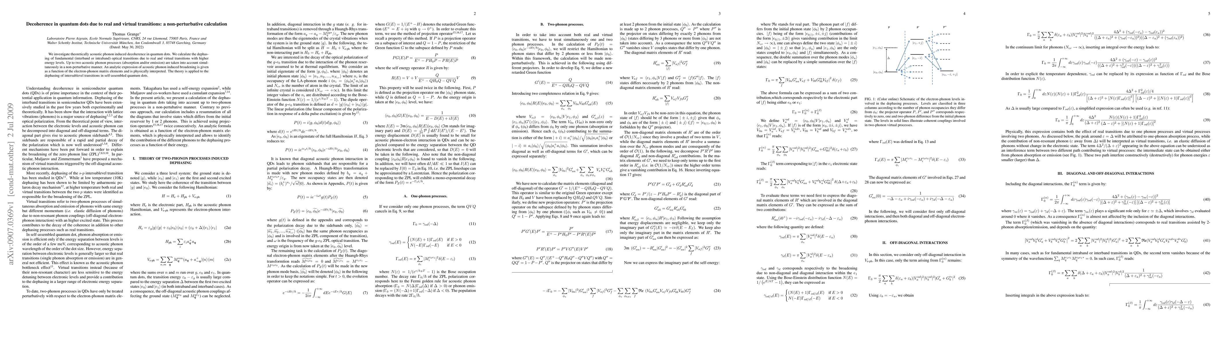 We investigate theoretically acoustic phonon induced decoherence in quantum dots. We calculate the dephasing of fundamental (interband or intraband) optical transitions due to real and virtual transitions with higher energy levels. Up to two acoustic phonon processes (absorption and/or emission) are taken into account simultaneously in a non-perturbative manner. An analytic expression of acoustic phonon induced broadening is given as a function of the electron-phonon matrix elements and is physically interpreted. The theory is applied to the dephasing of intersublevel transitions in self-assembled quantum dots.