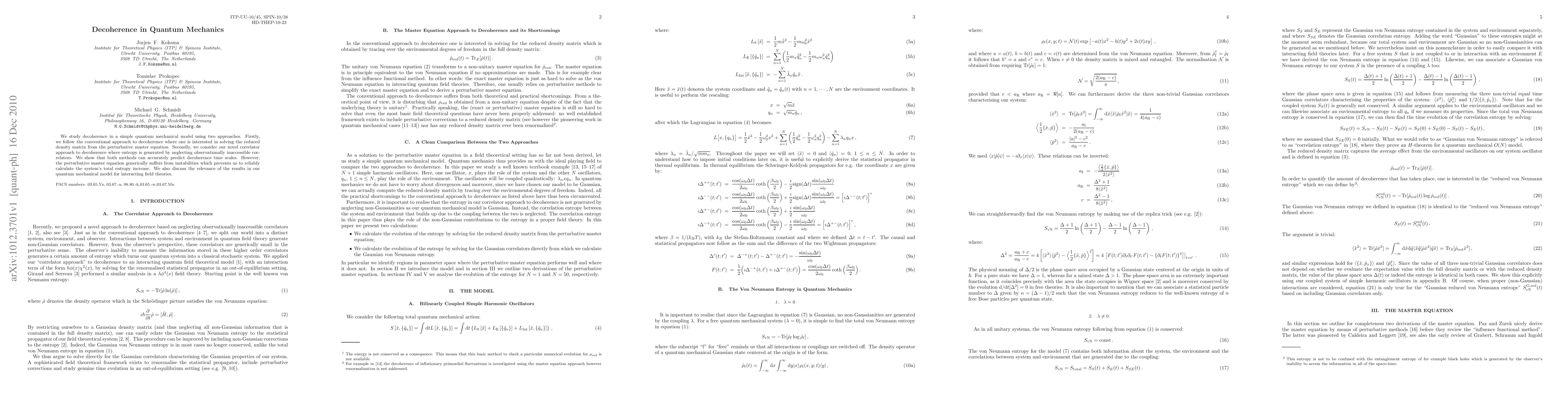 This paper investigates decoherence in quantum mechanics using two methods: the conventional perturbative master equation and a novel correlator approach. Both methods predict accurate decoherence time scales, but the master equation suffers from instabilities, hindering reliable entropy calculations. The study also explores the implications for interacting field theories.
